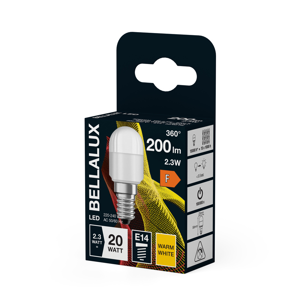 Specjalne lampy LED do lodówek. Cechy produktu: Lampy niezawierające rtęci. Zalety produktu: Niższe zużycie energii w porównaniu do lamp żarowych lub halogenowych. Równomierny rozsył światła we wszystkich kierunkach. Obszary zastosowań: Małe oprawy designerskie. Zamrażarki domowe. Maszyny szwalnicze. Zastosowania zewnętrzne - tylko w odpowiednich oprawach. Porady dotyczące bezpieczeństwa: Nie dotykaj lampy, jeśli jest stłuczona.. Nie wolno używać, jeśli zewnętrzne źródło światła jest uszkodzone..