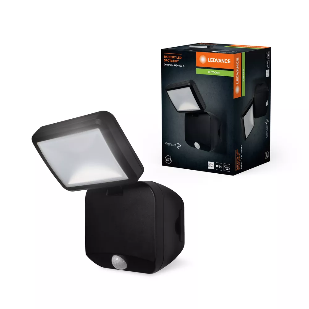 Oprawy oświetleniowe typu spotlight z pojedynczą głowicą. Cechy produktu: Strumień świetlny: do 260 lm. Zintegrowany czujnik ruchu i światła. Trwałość baterii przy stale włączonym oświetleniu: do 10 godzin. Stopień ochrony: IP54. Zalety produktu: Oświetlenie zgodne z zapotrzebowaniem i oszczędność energii zapewnia czujnik ruchu i światła. Niezależne źródło zasilania dzięki technologii akumulatorowej. Wydajne energetycznie dzięki technologii LED. Obszary zastosowań: Na zewnątrz. Miejsca, w których nie jest dostępne zasilanie sieciowe. Wyposażenie / Akcesoria: Śruby i kołki montażowe dostarczone w zestawie. Porady dotyczące bezpieczeństwa: Ten produkt nie jest zabawką. Nie powinien być pozostawiany bez nadzoru w rękach dzieci ani obsługiwany przez dzieci.. Nie jest przeznaczony do zastępowania tradycyjnego oświetlenia w gospodarstwach domowych.. Ostrzeżenie dotyczące baterii: Przechowywać poza zasięgiem dzieci. Połknięcie może prowadzić do oparzeń chemicznych, perforacji tkanek miękkich i śmierci. Ciężkie oparzenia mogą wystąpić w ciągu 2 godzin od połknięcia. Natychmiast zasięgnij porady lekarza. . Jeśli komora baterii (jeśli dotyczy) nie zamyka się bezpiecznie, zaprzestań używania produktu i trzymaj go z dala od dzieci. Jeśli podejrzewasz, że baterie mogły zostać połknięte lub umieszczone w jakiejkolwiek części ciała, natychmiast zwróć się o pomoc lekarską.. Prosimy unikać: Maksymalna temperatura otoczenia: +35 °C. Wymiana baterii na nieprawidłowy typ, który może obejść zabezpieczenie (na przykład w przypadku niektórych typów baterii litowych). Wysokość podczas pracy: 2000 m. Utylizacja baterii w ogniu lub gorącym piekarniku, lub mechaniczne zgniatanie lub cięcie baterii, co może spowodować wybuch..