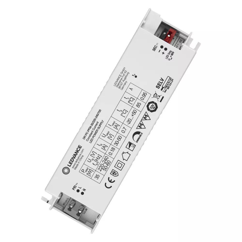 Stałoprądowe zasilacze LED z funkcją ściemniania, regulacja fazowa. Cechy produktu: Dostępne wersje o mocy: 13 W, 18 W, 25 W i 35 W. Niezależna instalacja dzięki opcjonalnemu zestawowi zacisków przewodów. Dimmable on the leading edge and trailing edge. Regulacja w zakresie 10…100%. Trwałość: do 50 tys. godzin (przy maks. temperaturze tc). Stopień ochrony: IP20. Dedykowany, stały prąd wyjściowy. Niskie tętnienie prądu < 5%. Napięcie zasilania: 220…240 V. Częstotliwość pracy: 50/60 Hz. Praca z napięciem poniżej 60 V: bezpieczne, niskie napięcie (SELV). Odwracalna ochrona przed przegrzaniem, przeciążeniem i zwarciem. Zalety produktu: Umożliwia instalację z powszechnie stosowanymi regulatorami fazowymi (regulacja na zboczu narastającym i opadającym). 5-letnia gwarancja. Smukła obudowa umożliwia instalację w ograniczonych przestrzeniach. Bardzo wysoka wydajność i niezawodność. Obszary zastosowań: Odpowiednie do opraw oświetleniowych i modułów LED. Odpowiednie do opraw o stopniu ochrony I i II. Odpowiednie do instalacji oświetlenia wewnętrznego typu SELV. Biura, centra/ galerie handlowe, szpitale, restauracje, hotele. Wyposażenie / Akcesoria: Zestaw zacisków do przewodów zapewniających prawidłowe odciążenie.