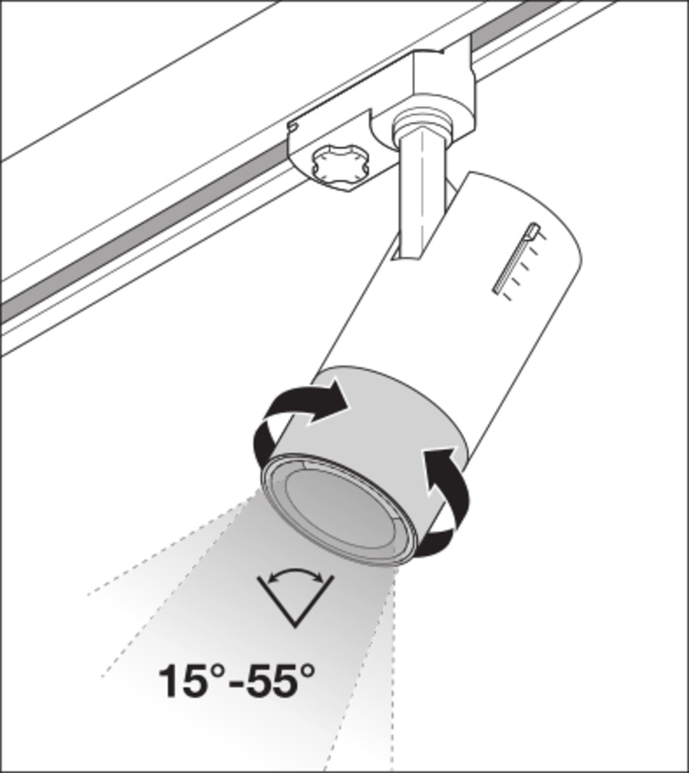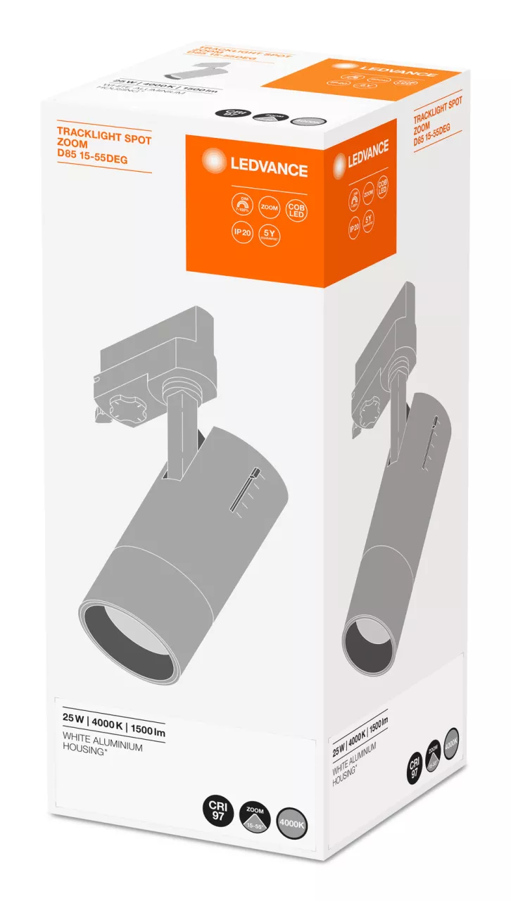 Oprawy oświetlenia punktowego do szynowych systemów zasilania 3- fazowego, ze ściemnianiem, klosz z mechaniczną regulacją ogniskowej. Cechy produktu: Mechaniczna regulacja kąta rozsyłu światła w zakresie od 15 ° do 55 °. Możliwość ściemniania (7% - 100%) przy pomocy potencjometru suwakowego umieszczonego na każdej oprawie. Wskaźnik oddawania barw Ra9: > 90. Początkowa jednolitość barw: ≤ 4 SDCM. Kąt obrotu: 350°, kąt odchylenia: 90°. Zgodność ze zunifikowanym językiem projektowania LEDVANCE (projekt SCALE). Solidna obudowa z odlewu ciśnieniowego aluminium. Dostępny w kolorze białym matowym (zbliżonym do RAL9016), matowym czarnym (zbliżonym do RAL9004). Skuteczność świetlna oprawy: do 70 lm/W. Zalety produktu: 3-fazowe oprawy punktowe, z możliwością ściemnianiania, klosz z mechaniczną regulacją zoom. W zestawie 3-fazowy adapter kompatybilny ze standardowymi listwami zasilającymi (GLOBAL, EUTRAC, POWERGEAR, STAFF, NORLUX, NUCO, NORDIC). Brak odwracania uwagi od oświetlanych obiektów dzięki minimalistycznej konstrukcji. Niewielkie tętnienie światła dzięki specjalnemu statecznikowi elektronicznemu. 5-letnia gwarancja. Obszary zastosowań: Bezpośredni zamiennik opraw oświetleniowych wykorzystujących lampy wyładowcze. Oświetlenie akcentujące. Galerie, muzea. Sklepy, przebieralnie, witryny sklepowe. Hotele, restauracje, sklepy. Porady dotyczące bezpieczeństwa: Wszystkie podłączenia elektryczne muszą być wykonane przez osobę wykwalifikowaną.. Uwaga, ryzyko porażenia prądem..