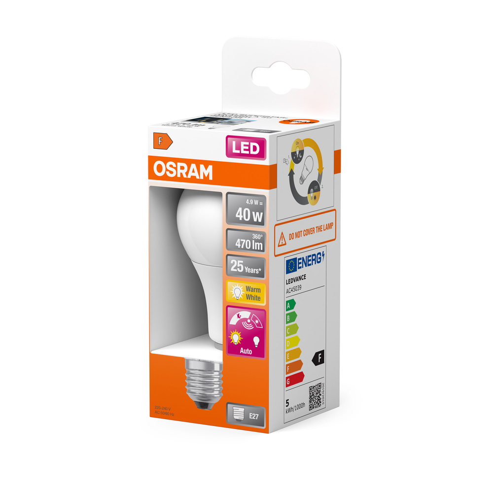 Specjalne lampy LED z czujnikiem światła w kształcie klasycznej żarówki. Cechy produktu: LED zamienniki tradycyjnych żarówek. Wysoka jedorodność barw: ≤ 6 SDCM. Lampy niezawierające rtęci. Zintegrowany czujnik światła wykrywa poziom natężenia oświetlenia światła dziennego co 10 minut i włącza się/wyłącza automatycznie. Zalety produktu: Krótki okres zwrotu inwestycji dzięki niskiemu zużyciu energii i niskim kosztom konserwacji. Energooszczędne rozwiązania oświetleniowe dzięki automatycznemu wyłączaniu przy świetle dziennym (> 20 luksów). Bezpieczeństwo dzięki automatycznemu włączaniu w ciemności (< 20 luksów). Niższe zużycie energii w porównaniu do lamp żarowych lub halogenowych. Prosty w użyciu zamiennik żarówek klasycznych dzięki kompaktowej konstrukcji. Natychmiast 100 % światła, bez czasu nagrzewania. Obszary zastosowań: Do użytku na zewnątrz tylko w odpowiednich oprawach zewnętrznych. Tam, gdzie w nocy oświetlenie musi być stale włączone. Porady dotyczące bezpieczeństwa: Nie dotykaj lampy, jeśli jest stłuczona.. Nie wolno używać, jeśli zewnętrzne źródło światła jest uszkodzone..