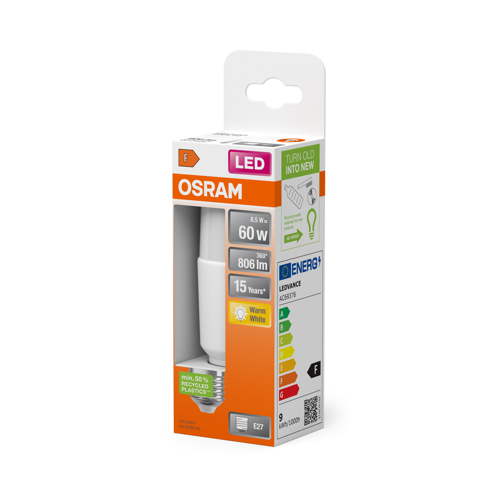 Lampy LED z tworzywa sztucznego pochodzącego z recyklingu. Cechy produktu: LED zamienniki tradycyjnych żarówek. Dobra jakość światła, wskaźnik oddawania barw Ra: ≥ 80; stała chromatyczność. Zalety produktu: Niższe zużycie energii w porównaniu do lamp żarowych lub halogenowych. Atrakcyjny wygląd lamp. Obszary zastosowań: Wszystkie pomieszczenia mieszkalne, zwłaszcza tam, gdzie lampy są widoczne. Tam, gdzie potrzebne są wydajne lampy kompaktowe. Tam, gdzie od lamp wymaga się długiej trwałości lub odporności na częste włączanie i wyłączanie. Do użytku na zewnątrz tylko w odpowiednich oprawach zewnętrznych. Porady dotyczące bezpieczeństwa: Nie dotykaj lampy, jeśli jest stłuczona.. Nie wolno używać, jeśli zewnętrzne źródło światła jest uszkodzone..