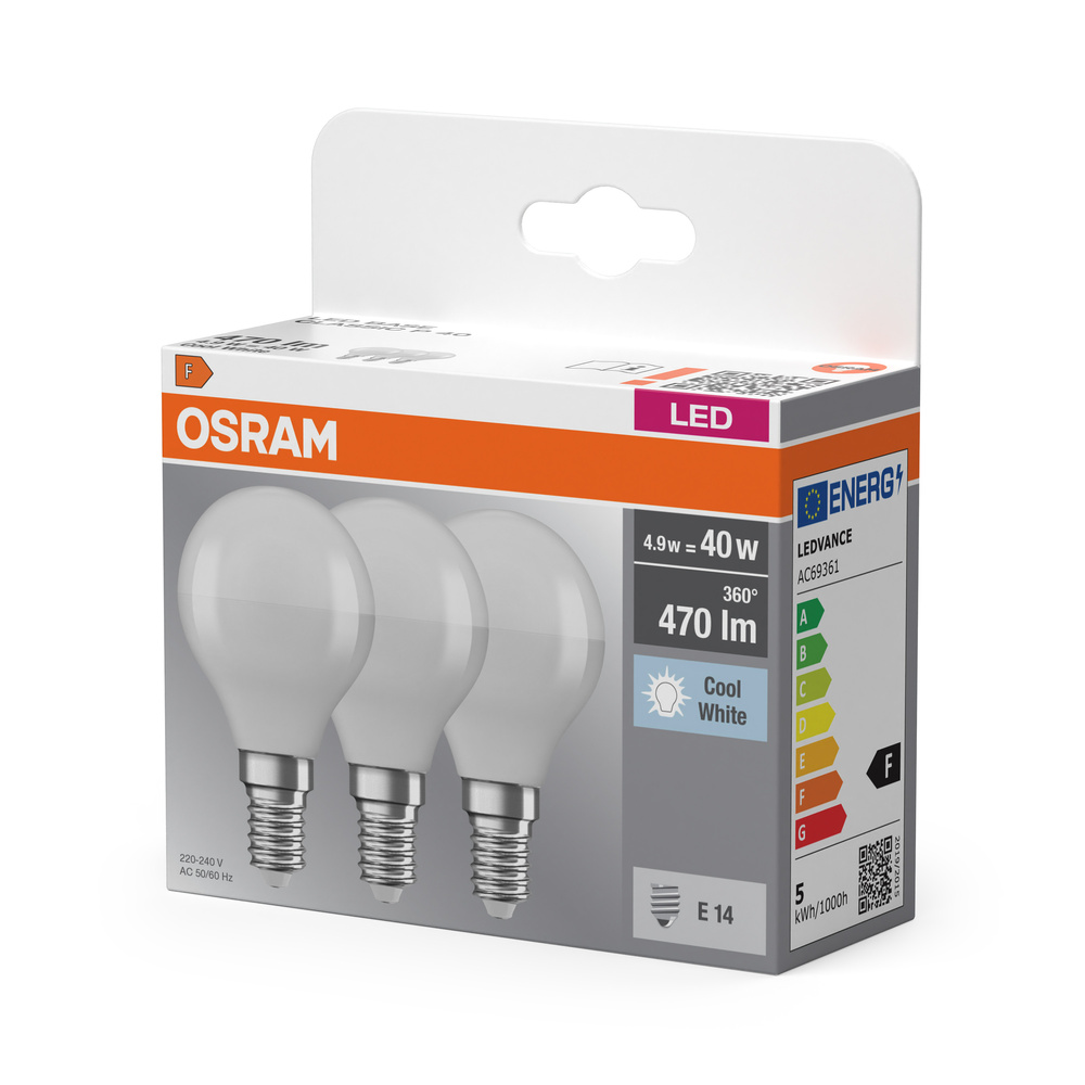 Lampy LED w kształcie klasycznej żarówki kulistej. Cechy produktu: Profesjonalne lampy dla napięcia sieciowego. Trzonek: E14. Nieprzystosowane do pracy z regulatorami. Lampy niezawierające rtęci. Zalety produktu: Niskie obciążenie cieplne (w porównaniu ze standardowym produktem referencyjnym). Niższe zużycie energii w porównaniu do lamp żarowych lub halogenowych. Odporność na wstrząsy i drgania dzięki technologii LED. Brak promieniowania UV i podczerwonego w wiązce światła. Natychmiast 100 % światła, bez czasu nagrzewania. Bezpośrednio zastępuje zwykłe żarówki. Obszary zastosowań: Oświetlenie ogólne. Zastosowania domowe. Do użytku na zewnątrz tylko w odpowiednich oprawach zewnętrznych. Porady dotyczące bezpieczeństwa: Nie dotykaj lampy, jeśli jest stłuczona.. Nie wolno używać, jeśli zewnętrzne źródło światła jest uszkodzone..