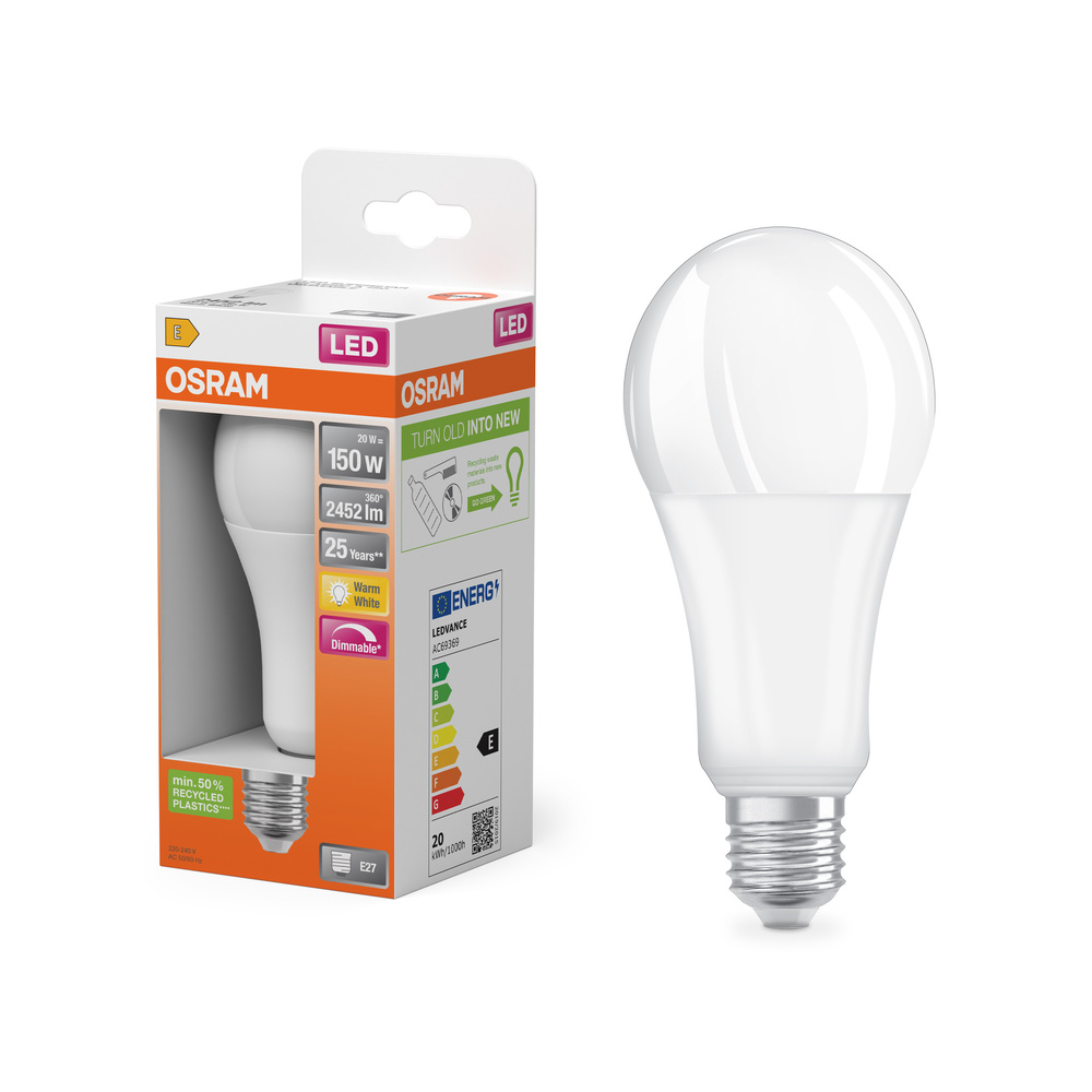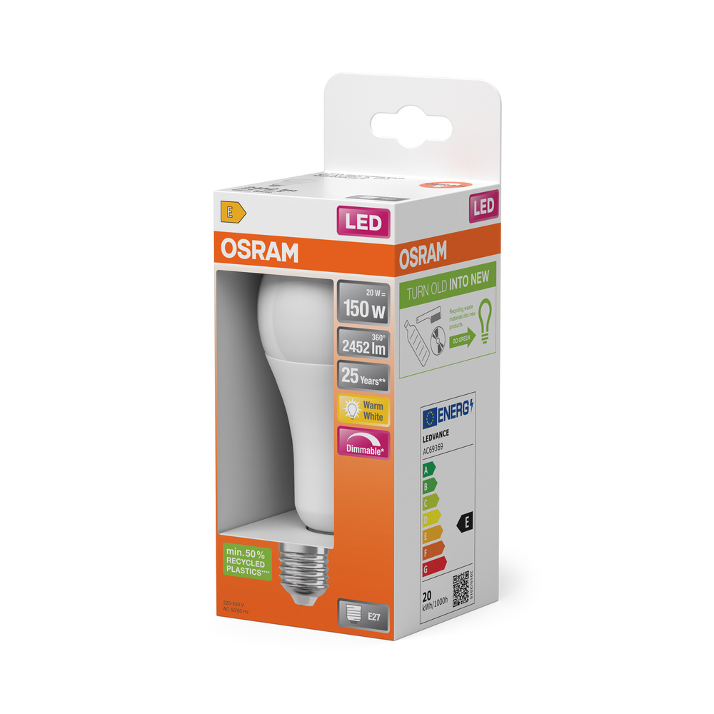 Lampy LED z tworzywa sztucznego pochodzącego z recyklingu. Cechy produktu: LED zamienniki tradycyjnych żarówek. Dobra jakość światła; wskaźnik oddawania barw Ra:80; stała chromatyczność. Wysoka jedorodność barw: ≤ 6 SDCM. Możliwość regulacji strumienia świetlnego (za pomocą wielu popularnych ściemniaczy, patrz również www.osram-lamps.com/dim). Lampy niezawierające rtęci. Zalety produktu: Niższe zużycie energii w porównaniu do lamp żarowych lub halogenowych. Wysoka spójność barw dzięki precyzyjnemu sortowaniu struktur półprzewodnikowych. Prosty w użyciu zamiennik żarówek klasycznych dzięki kompaktowej konstrukcji. Natychmiast 100 % światła, bez czasu nagrzewania. Obszary zastosowań: Zastosowania domowe. Oświetlenie ogólne. Do użytku na zewnątrz tylko w odpowiednich oprawach zewnętrznych. Porady dotyczące bezpieczeństwa: Nie dotykaj lampy, jeśli jest stłuczona.. Nie wolno używać, jeśli zewnętrzne źródło światła jest uszkodzone..