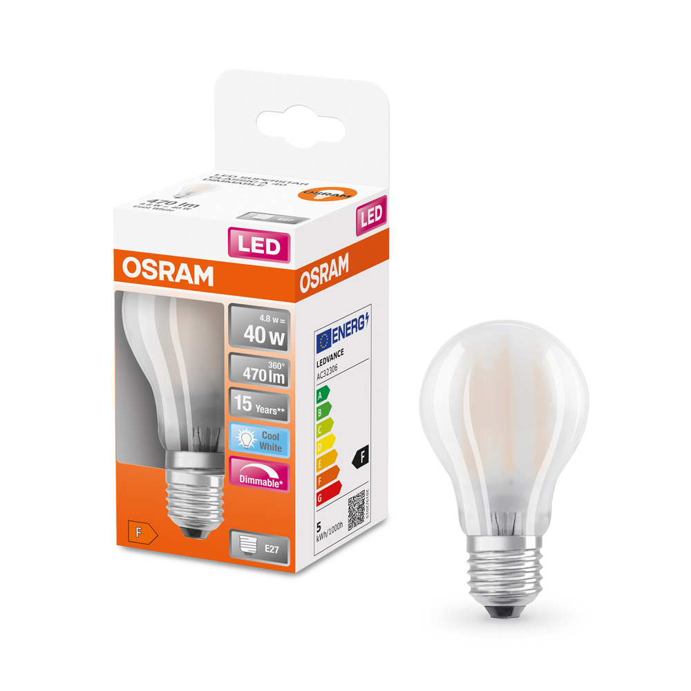 Ściemnialne lampy LED, klasyczny kształt żarówki . Cechy produktu: Profesjonalne lampy dla napięcia sieciowego. Ściemnialne (za pomocą licznych popularnych ściemniaczy, zobacz więcej www.ledvance.pl/dim). Kąt wiązki światła: do 360°. Trwałość do 15 000 h. Lampa wykonana ze szkła. Dobra jakość światła, wskaźnik oddawania barw Ra: ≥ 80; stała chromatyczność. Zalety produktu: Lampy wyposażone w innowacyjną technologię „włókien” LED. Niższe zużycie energii w porównaniu do lamp żarowych lub halogenowych. Brak promieniowania UV i podczerwonego w wiązce światła. Natychmiast 100 % światła, bez czasu nagrzewania. Łatwy montaż zamiast zwykłych żarówek. Niskie obciążenie cieplne (w porównaniu ze standardowym produktem referencyjnym). Wygląd, wymiary i strumień świetlny porównywalne z żarówkami halogenowymi. Obszary zastosowań: Doskonałe rozwiązanie do instalacji dekoracyjnych. Zastosowania domowe. Oświetlenie ogólne. Do użytku na zewnątrz tylko w odpowiednich oprawach zewnętrznych. Porady dotyczące bezpieczeństwa: Nie dotykaj lampy, jeśli jest stłuczona.. Nie wolno używać, jeśli zewnętrzne źródło światła jest uszkodzone..