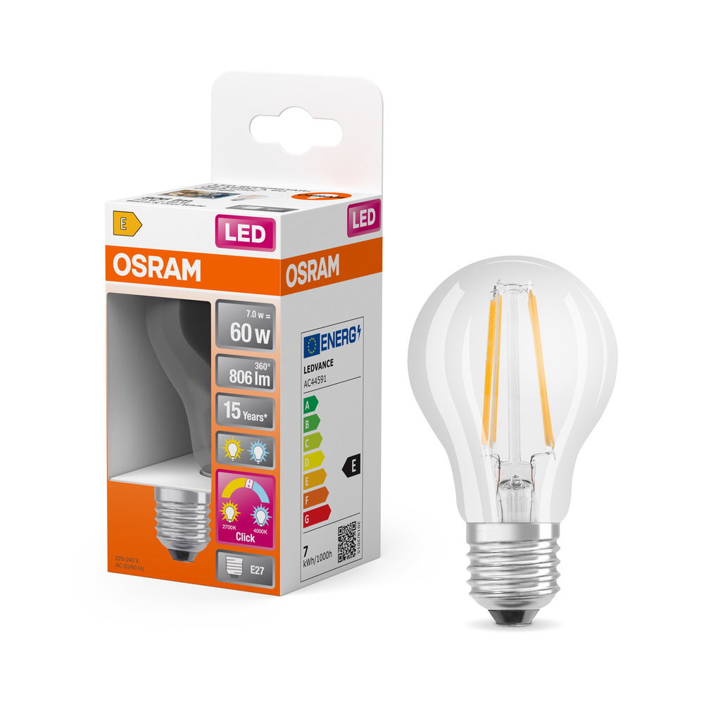 Lampy LED, klasyczny kształt żarówki. Cechy produktu: Możliwość wyboru temperatury barwowej światła 2700 K i 4000 K w tej samej lampie. Możliwość sterowania przy pomocy standardowego przełącznika ściennego. Dobra jakość światła, wskaźnik oddawania barw Ra: ≥ 80. Zalety produktu: Możliwość wyboru scen oświetleniowych: światła ciepłobiałego w chwilach relaksu lub zimnobiałego w chwilach aktywności. Łatwa zmiana temperatury barwowej światła poprzez dwukrotne naciśnięcie przełącznika w ścianie. Światło zawsze dopasowane do sytuacji dzięki dwóm barwom światła w jednej lampie: ciepłobiałej i zimnobiałej. Wspiera naturalny biorytm poprzez stymulujące i relaksujące barwy światła. Długa trwałość do 15 000 godzin. Niższe zużycie energii w porównaniu do lamp żarowych lub halogenowych. Łatwa wymiana lamp dzięki kompaktowej konstrukcji. Pomieszczenia można dopasować do różnych sytuacji dzięki zmianie temperatury barwowej. Zmienia kuchnie, pokoje dzienne i biura domowe w miejsce pracy lub relaksu. Obszary zastosowań: W przypadku stosowania w dziecięcych sypialniach wspiera naturalny biorytm. Do użytku na zewnątrz tylko w odpowiednich oprawach zewnętrznych. Porady dotyczące bezpieczeństwa: Nie dotykaj lampy, jeśli jest stłuczona.. Nie wolno używać, jeśli zewnętrzne źródło światła jest uszkodzone..