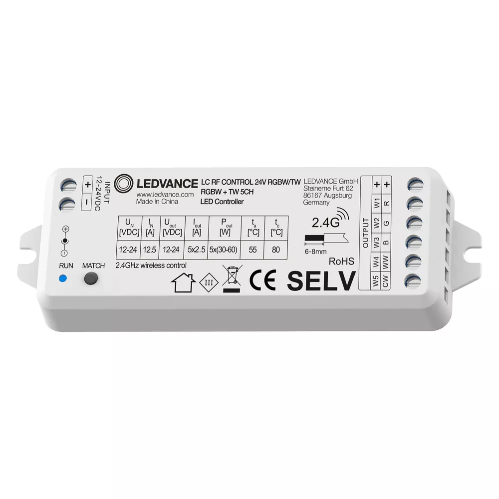Sterownik z funkcją ściemniania z technologią radiową. Cechy produktu: Nadrzędny odbiornik radiowy LED 2,4 GHz. 5 kanałów dla aplikacji RGB, RGBW i Tunable White. Napięcie zasilające: 12 V i 24 V. Wysoka wydajność, obciążenie na kanał do 60 W przy zasilaniu napięciem 12-24 V. Zalety produktu: Opcje sterowania za pomocą pilota radiowego lub sterownika radiowego. Regulacja strumienia świetlnego poprzez modulację szerokości impulsu (PWM). Proste i szybkie połączenie dzięki funkcji MATCH. Logarytmiczna charakterystyka regulacji w zakresie 0-100%. Obszary zastosowań: Oświetlenie ogólne. Oświetlenie fasad budynków. Światło dynamiczne jako efekt architektoniczny w miejscach publicznych. Oświetlenie faset. Hotele. Biura. Pomieszczenia mieszkalne. Porady dotyczące bezpieczeństwa: Wszystkie podłączenia elektryczne muszą być wykonane przez osobę wykwalifikowaną.. Przed instalacją należy odłączyć zasilanie..