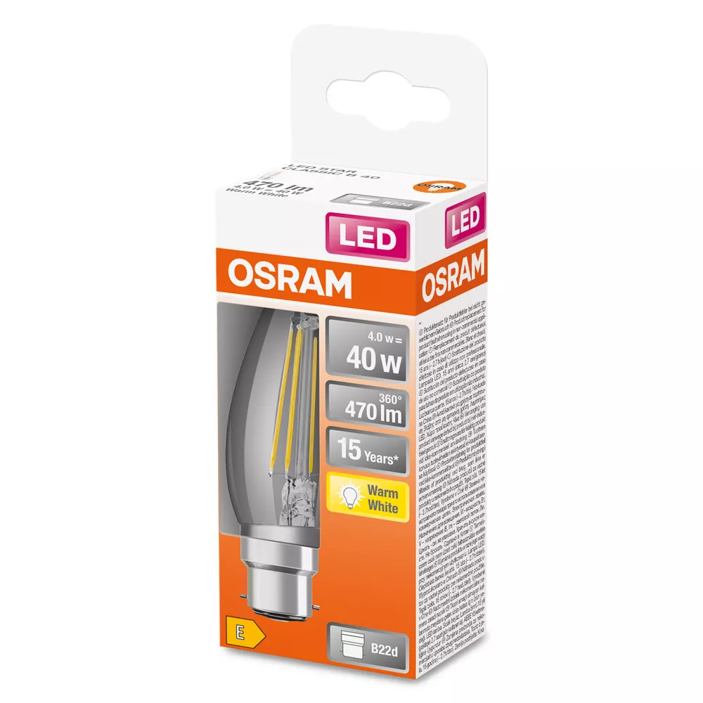 Lampy LED w kształcie klasycznej żarówki świecowej. Cechy produktu: Profesjonalne lampy dla napięcia sieciowego. Brak możliwości regulacji strumienia świetlnego. Dobra jakość światła, wskaźnik oddawania barw R<sub>a</sub>: ≥ 80; stała chromatyczność. Trwałość do 15 000 h. Lampa wykonana ze szkła. Zalety produktu: Lampy wyposażone w innowacyjną technologię „włókien” LED. Wygląd, wymiary i strumień świetlny porównywalne z tradycyjnymi żarówkami lub żarówkami halogenowymi. Brak promieniowania UV i podczerwonego w wiązce światła. Natychmiast 100 % światła, bez czasu nagrzewania. Niskie obciążenie cieplne (w porównaniu ze standardowym produktem referencyjnym). Łatwy montaż zamiast zwykłych żarówek. Niższe zużycie energii w porównaniu do lamp żarowych lub halogenowych. Obszary zastosowań: Doskonałe rozwiązanie do instalacji dekoracyjnych. Zastosowania domowe. Oświetlenie ogólne. Do użytku na zewnątrz tylko w odpowiednich oprawach zewnętrznych. Porady dotyczące bezpieczeństwa: Nie dotykaj lampy, jeśli jest stłuczona.. Nie wolno używać, jeśli zewnętrzne źródło światła jest uszkodzone..