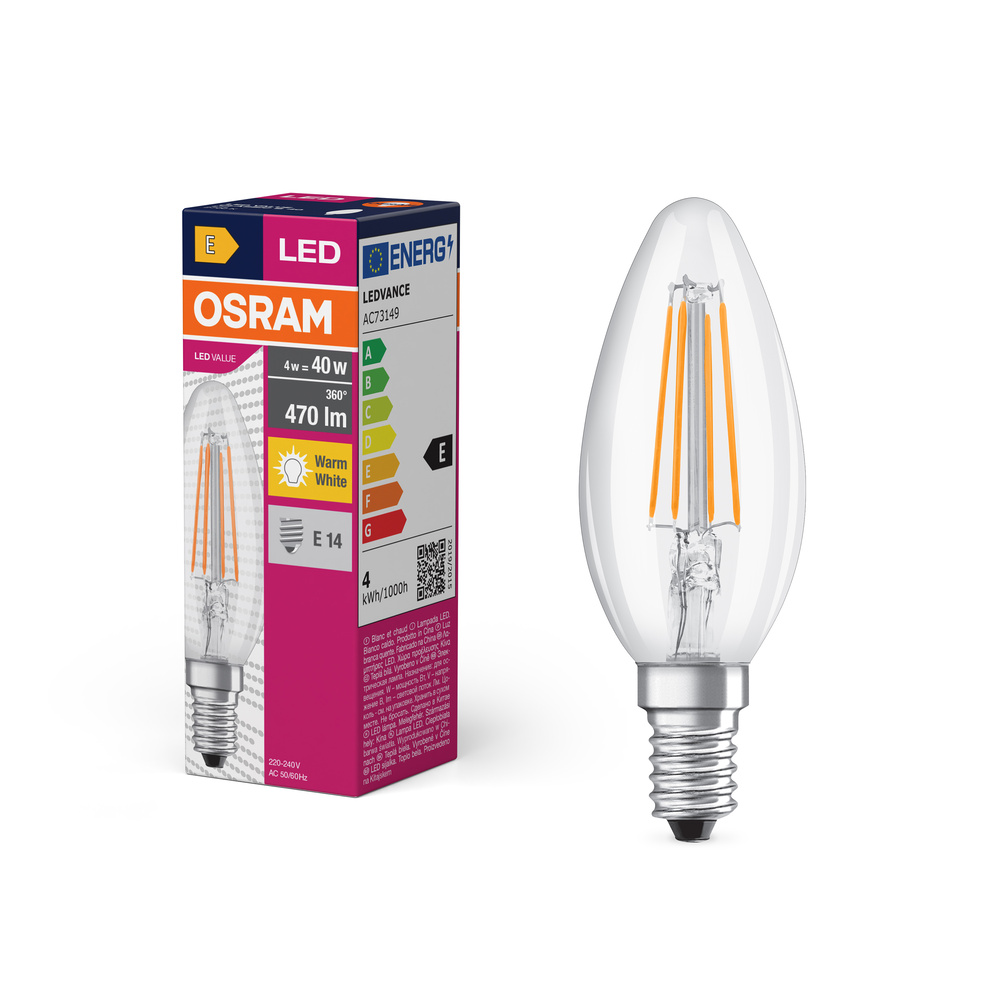 Lampy LED w kształcie klasycznej żarówki świecowej. Cechy produktu: LED zamienniki tradycyjnych żarówek. Brak możliwości regulacji strumienia świetlnego. Dobre oddawanie barw (Ra ≥ 80) i stabilność braw przez cały czas eksploatacji lampy. Zalety produktu: Niższe zużycie energii w porównaniu do lamp żarowych lub halogenowych. Bezpośrednio zastępuje zwykłe żarówki. Natychmiast 100 % światła, bez czasu nagrzewania. Obszary zastosowań: Oświetlenie ogólne. Zastosowania domowe. Żyrandole. Do użytku na zewnątrz tylko w odpowiednich oprawach zewnętrznych. Porady dotyczące bezpieczeństwa: Nie dotykaj lampy, jeśli jest stłuczona.. Nie wolno używać, jeśli zewnętrzne źródło światła jest uszkodzone..