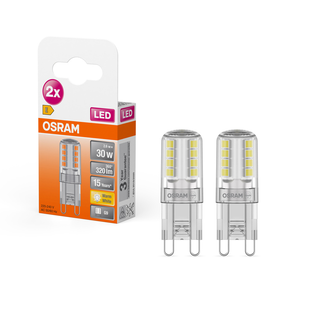 Lampy LED z trzonkiem G9. Cechy produktu: Zamienniki LED dla konwencjonalnych żarówek wysokonapięciowych. Dobra jakość światła, wskaźnik oddawania barw Ra: ≥ 80; stała chromatyczność. Zalety produktu: Równomierny rozsył światła we wszystkich kierunkach. Długa trwałość do 15 000 godzin. Idealne do zastosowania dekoracyjnego oraz do eksploatacji bez oprawy. 3-letnia gwarancja. Niższe zużycie energii w porównaniu do lamp żarowych lub halogenowych. Obszary zastosowań: Nastrojowe oświetlenie akcentujące w całym domu. Sklepy, hotele i restauracje. Do użytku na zewnątrz tylko w odpowiednich oprawach zewnętrznych. Porady dotyczące bezpieczeństwa: Nie dotykaj lampy, jeśli jest stłuczona.. Nie wolno używać, jeśli zewnętrzne źródło światła jest uszkodzone.. Aby zapewnić pełną wydajność oświetlenia i trwałość produktu, zalecane jest demontaż szyby lub osłony oprawy oświetleniowej..