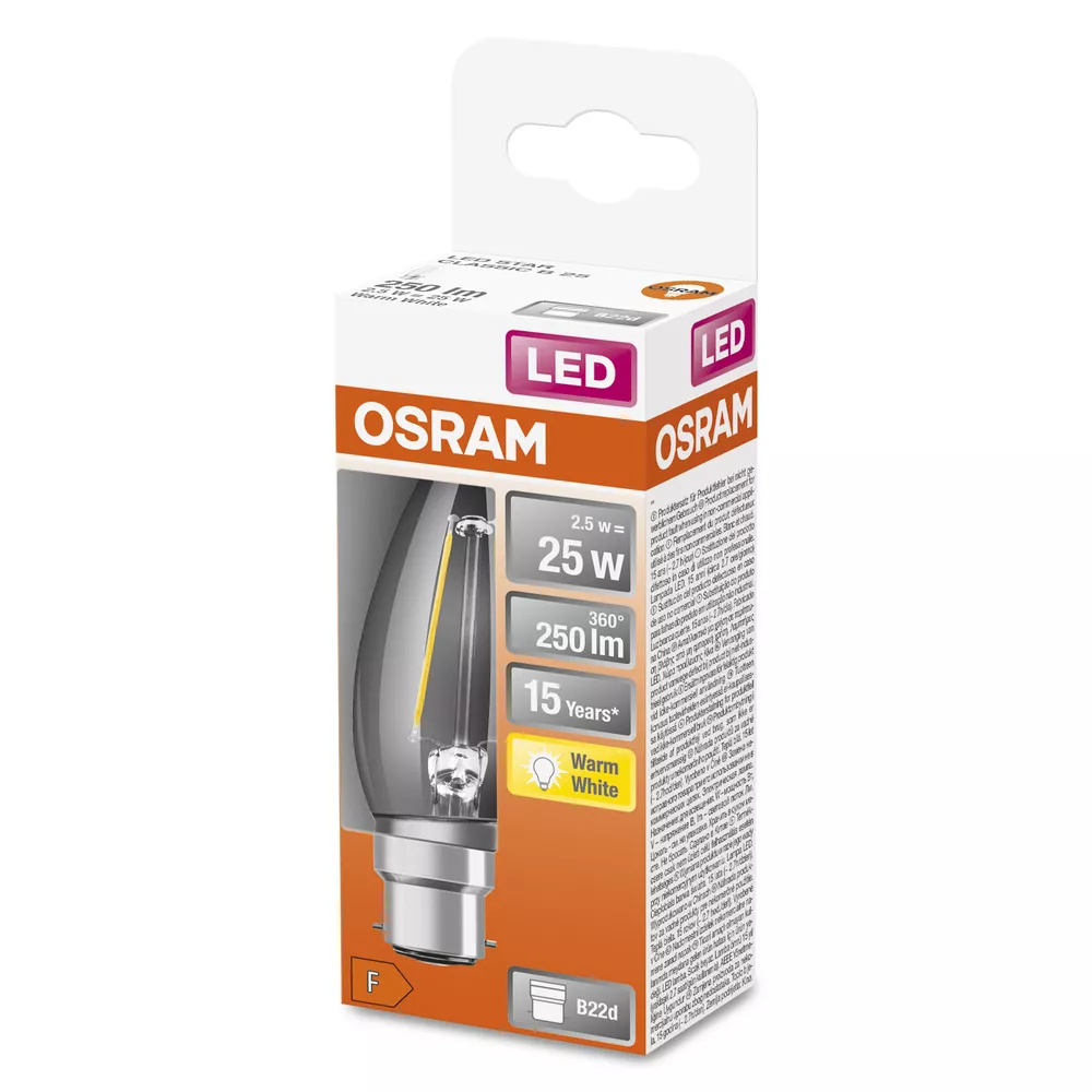 Lampy LED w kształcie klasycznej żarówki świecowej. Cechy produktu: Profesjonalne lampy dla napięcia sieciowego. Brak możliwości regulacji strumienia świetlnego. Dobra jakość światła, wskaźnik oddawania barw Ra: ≥ 80; stała chromatyczność. Trwałość do 15 000 h. Lampa wykonana ze szkła. Zalety produktu: Lampy wyposażone w innowacyjną technologię „włókien” LED. Wygląd, wymiary i strumień świetlny porównywalne z tradycyjnymi żarówkami lub żarówkami halogenowymi. Brak promieniowania UV i podczerwonego w wiązce światła. Natychmiast 100 % światła, bez czasu nagrzewania. Niskie obciążenie cieplne (w porównaniu ze standardowym produktem referencyjnym). Łatwy montaż zamiast zwykłych żarówek. Niższe zużycie energii w porównaniu do lamp żarowych lub halogenowych. Obszary zastosowań: Doskonałe rozwiązanie do instalacji dekoracyjnych. Zastosowania domowe. Oświetlenie ogólne. Do użytku na zewnątrz tylko w odpowiednich oprawach zewnętrznych. Porady dotyczące bezpieczeństwa: Nie dotykaj lampy, jeśli jest stłuczona.. Nie wolno używać, jeśli zewnętrzne źródło światła jest uszkodzone..