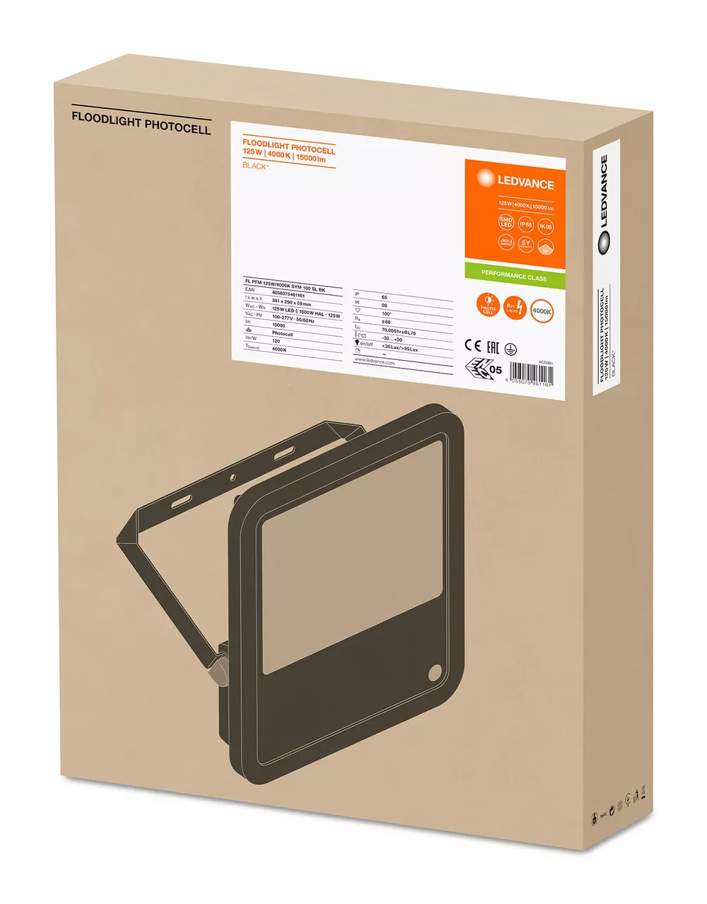 Oprawa Floodlight z czujnikiem światła, moc 125 W. Cechy produktu: Czujnik światła wbudowany w szklaną osłonę. Włączenie oświetlenia poniżej 35 lx, wyłączenie oświetlenia powyżej 95 lx. Odbłyśnik, symetryczny rozsył światła z kątem rozsyłu 100° x 100°. Zintegrowany zasilacz szerokonapięciowy, 100 - 277 V AC. Ochrona przed przepięciami: do 6 kV (L / N-PE), 4 kV (L-N). Zaciski montażowe z kątem 30° i szerokim obszarem obrotu. Zawór odpowietrzający optymalizujący wymianę powietrza, bez uszczerbku dla stopnia ochrony IP. Fabrycznie zainstalowany, elastyczny przewód o długości 1 m (H05RN-F), 3 x 1,0 mm². Zalety produktu: Jasna, odporna i trwała. Automatyczne włączanie i wyłączanie w zależności od ilości dostępnego światła dziennego. Możliwość wyłączenia działania czujnika, poprzez wykonanie odpowiedniej sekwencji włączania i wyłączania zasilania oprawy. Bezpieczne i bardzo równomierne oświetlenie dzięki wykonanemu ze szkła hartowanego matowemu kloszowi. Brak górnego współczynnika rozsyłu światła (ULOR 0%) w przypadku zamontowania pod kątem 0°. Oszczędność energii aż do 90% (w porównaniu z naświetlaczami z lampami halogenowymi). 5-letnia gwarancja. Obszary zastosowań: Zamiennik naświetlaczy do żarówek halogenowych. Zastosowanie na zewnątrz (IP65). Przemysł. Strefy publiczne. Tereny budowy. Elewacje budynków. Porady dotyczące bezpieczeństwa: Maksymalna. powierzchnia obciążenia wiatrem 0,083 m². Wszystkie podłączenia elektryczne muszą być wykonane przez osobę wykwalifikowaną.. Zewnętrzny elastyczny przewód lub przewód znajdujący się w oprawie oświetleniowej nie podlega wymianie; jeśli przewód ulegnie uszkodzeniu, oprawa zostanie zniszczona.. Blok zaciskowy nie jest dołączony. Montaż musi być wykonany przez osobę wykwalifikowaną.. Uwaga, ryzyko porażenia prądem.. Produkt w klasie ochrony I. Wszystkie przewodzące prąd, metalowe części obudowy, które mogą absorbować napięcie podczas pracy lub podczas konserwacji w przypadku awarii, muszą być stale PODŁĄCZONE do przewodu uziemiającego..