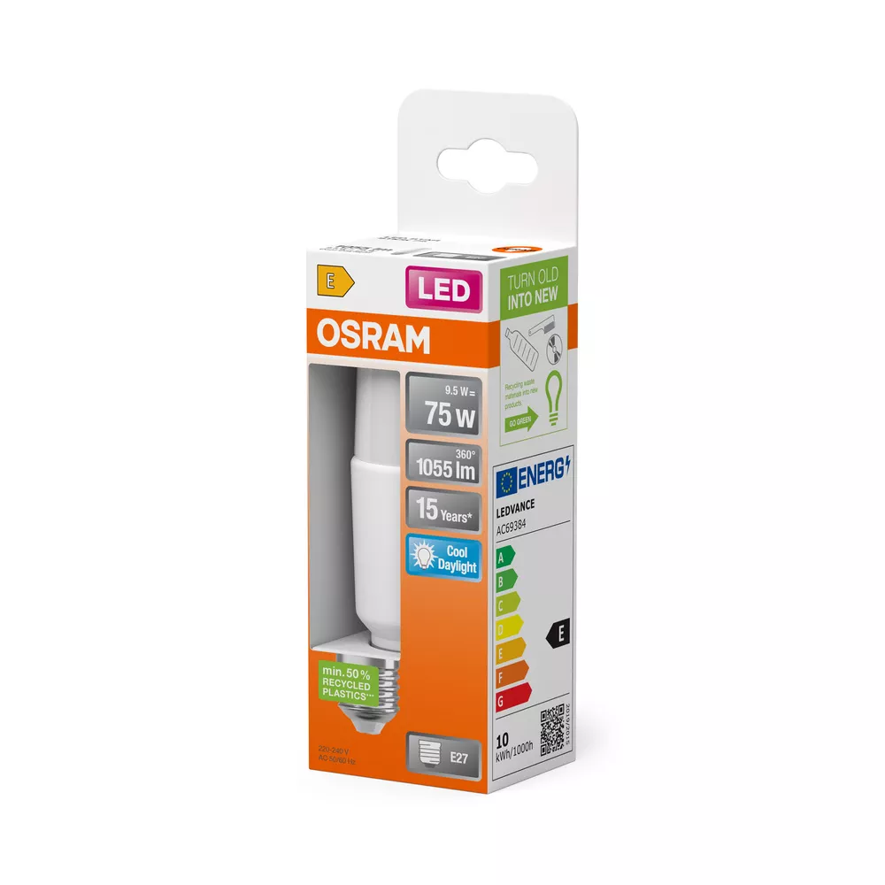 Lampy LED z tworzywa sztucznego pochodzącego z recyklingu. Cechy produktu: LED zamienniki tradycyjnych żarówek. Dobra jakość światła, wskaźnik oddawania barw Ra: ≥ 80; stała chromatyczność. Zalety produktu: Niższe zużycie energii w porównaniu do lamp żarowych lub halogenowych. Atrakcyjny wygląd lamp. Obszary zastosowań: Wszystkie pomieszczenia mieszkalne, zwłaszcza tam, gdzie lampy są widoczne. Tam, gdzie potrzebne są wydajne lampy kompaktowe. Tam, gdzie od lamp wymaga się długiej trwałości lub odporności na częste włączanie i wyłączanie. Do użytku na zewnątrz tylko w odpowiednich oprawach zewnętrznych. Porady dotyczące bezpieczeństwa: Nie dotykaj lampy, jeśli jest stłuczona.. Nie wolno używać, jeśli zewnętrzne źródło światła jest uszkodzone..