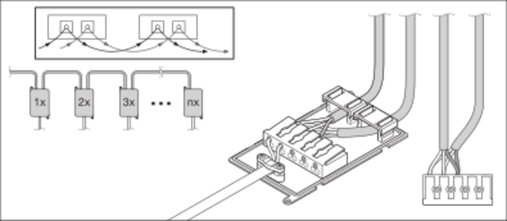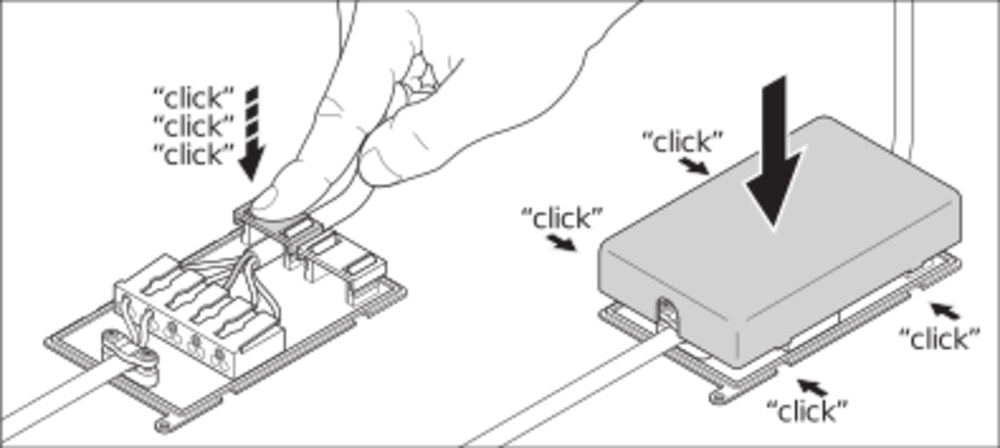 Złącza opraw do wbudowania. Cechy produktu: W zestawie znajduje się 5-biegunowe złącze. Do zastosowania w oprawach o II klasie ochronności. Nadaje się do wpuszczanych opraw DALI (wersja L/N/E/D+/D-). Zalety produktu: Instalacja elektryczna bez użycia narzędzi za pomocą wtyków. Możliwe wewnętrzne okablowanie dzięki dostarczonej w zestawie puszce podłączeniowej.