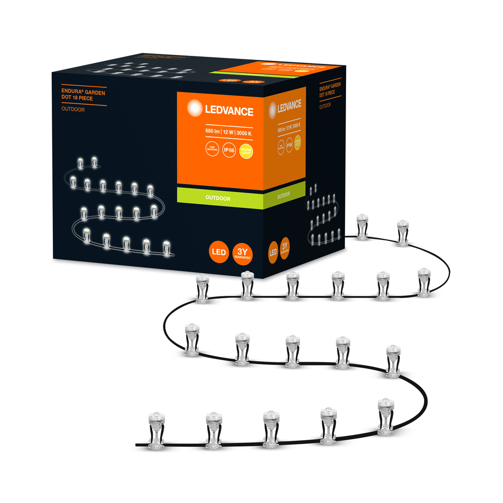 Dekoracyjne punkty świetlne do użytku na zewnątrz. Cechy produktu: Stopień ochrony (dots): IP65. Stopień ochrony (zasilacz): IP44. Rozszerzenie maksymalnie do 18 punktów. Temperatura barwowa: 3000 K (Warm White - ciepłobiała). Zalety produktu: Łatwa i szybka instalacja. Obszary zastosowań: Ogrody, balkony oraz inne miejsca na zewnątrz budynków. Wyposażenie / Akcesoria: Zasilacz sieciowy dostarczany wyłącznie w zestawie podstawowym. Kompletne akcesoria do montażu i podłączenia w zestawie. Porady dotyczące bezpieczeństwa: Aby ograniczyć ryzyko uduszenia, elastyczne przewody PODŁĄCZONE do tej oprawy należy solidnie przymocować do ściany, jeśli znajdują się w zasięgu ręki..