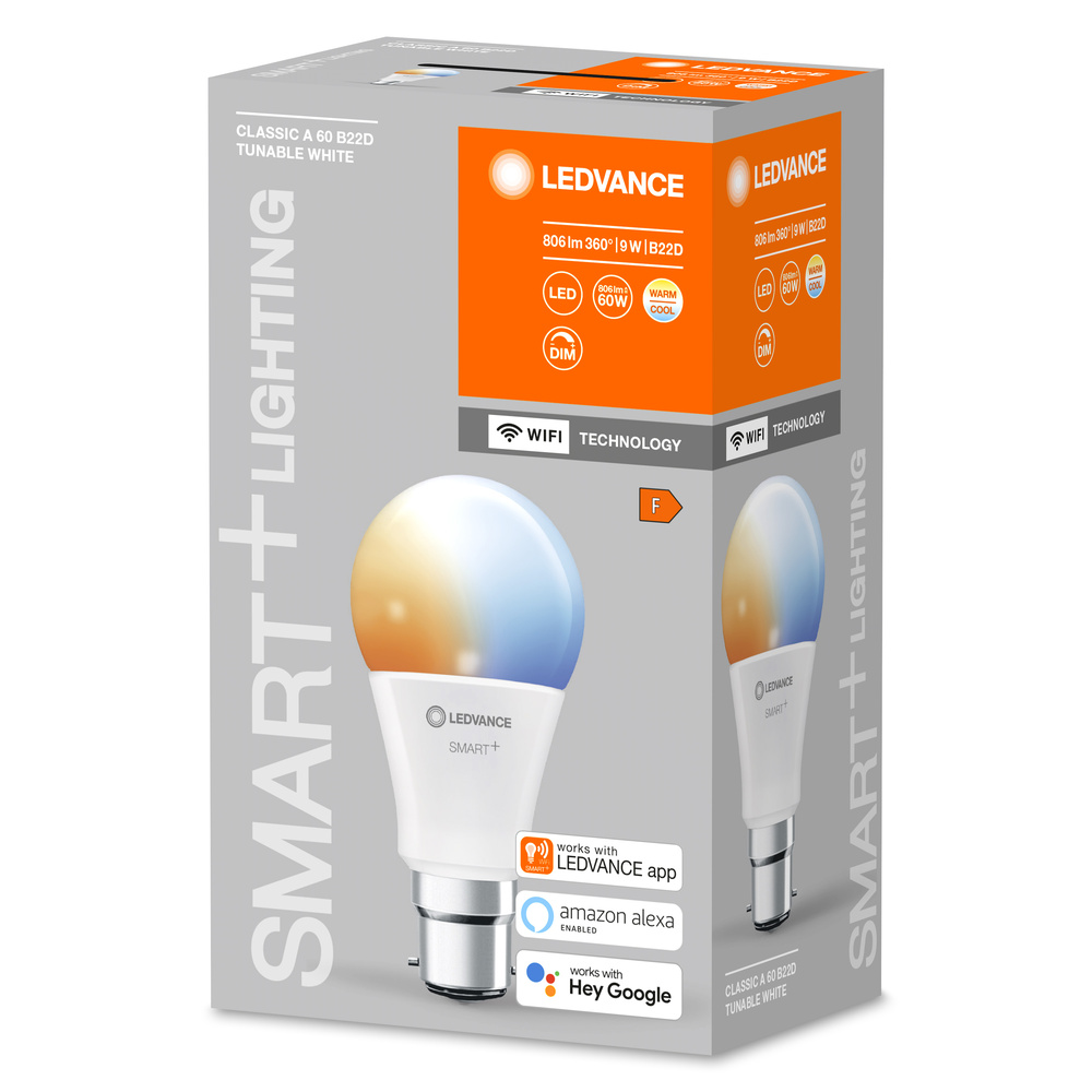 Klasyczny kształt żarówki z technologią WiFi. Cechy produktu: Sterowanie za pomocą aplikacji LEDVANCE SMART+ (z systemem Android™️ co najmniej 8.0 lub iOS 14.0). Możliwość sterowania przez Asystenta Google i Amazon Alexa. Protokół sieciowy: WiFi. Regulacja temperatury barwowej światła: 2700…6500 K. Ściemnialne. Trwałość do 15 000 h. Zalety produktu: Sterowanie bezprzewodowe za pomocą aplikacji. Łatwy montaż i użycie. Nie zawiera rtęci. Obszary zastosowań: Oświetlenie ogólne. Pomieszczenia mieszkalne. Zastosowania profesjonalne (hotele, bary, butiki itp.). Zastosowania zewnętrzne - tylko w odpowiednich oprawach. Wyposażenie / Akcesoria: Do sterowania za pomocą aplikacji LEDVANCE SMART+ wymagany jest smartfon lub tablet (z systemem Android co najmniej 8.0 lub iOS 14.0). Porady dotyczące bezpieczeństwa: Nie dotykaj lampy gołymi palcami.. Nie wolno używać, jeśli zewnętrzne źródło światła jest uszkodzone..