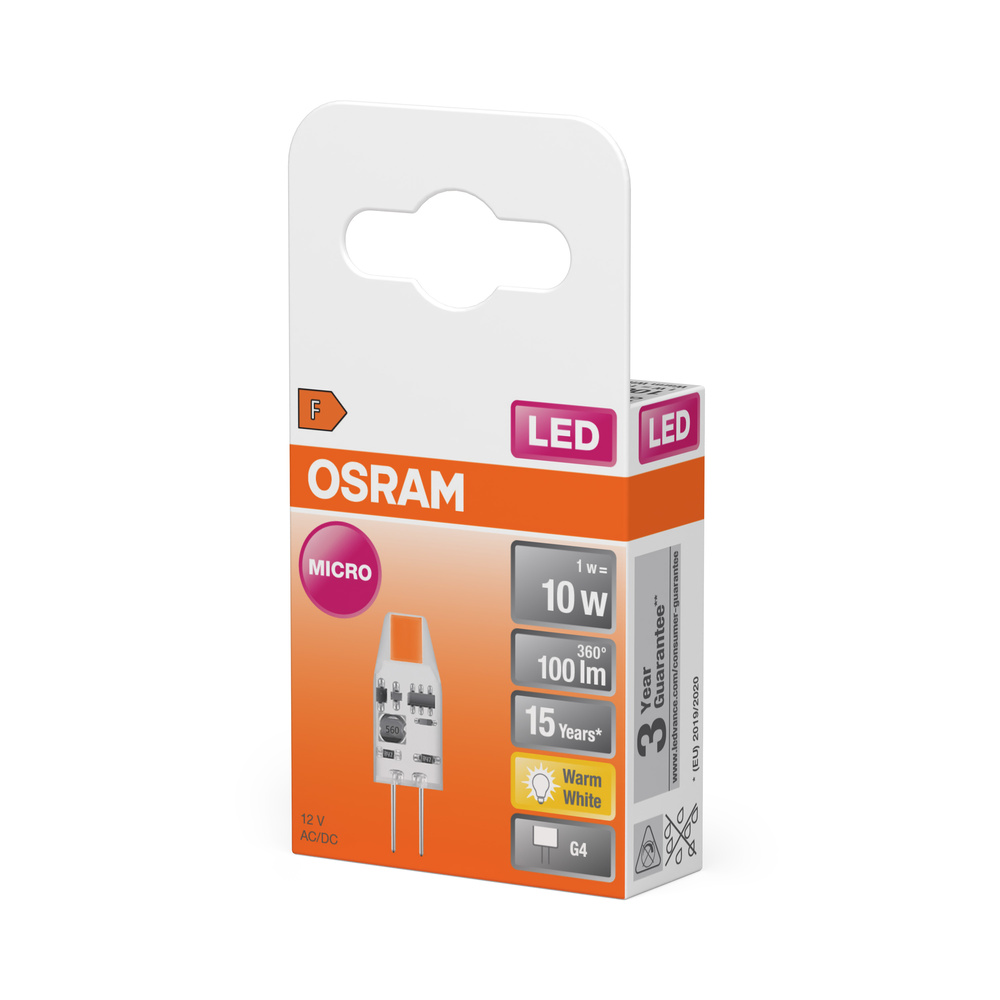 Małe, niskonapięciowe lampy LED 12 V z trzonkiem kołkowym. Cechy produktu: Zgodność z wieloma konwencjonalnymi i elektronicznymi zasilaczami (patrz również compatibility list). Zamiennik LED dla niskonapięciowych żarówek halogenowych. Trzonek: G4. Zalety produktu: Wyjątkowo małe wymiary. Praca alternatywnie z zasilaniem prądem stałym lub przemiennym. Równomierny rozsył światła we wszystkich kierunkach. Idealne do zastosowania dekoracyjnego oraz do eksploatacji bez oprawy. Długa trwałość do 15 000 godzin. 3-letnia gwarancja. Niższe zużycie energii w porównaniu do lamp żarowych lub halogenowych. Obszary zastosowań: Zastosowania dekoracyjne. Nastrojowe oświetlenie akcentujące w całym domu. Do użytku na zewnątrz tylko w odpowiednich oprawach zewnętrznych. Porady dotyczące bezpieczeństwa: Nie dotykaj lampy, jeśli jest stłuczona.. Nie wolno używać, jeśli zewnętrzne źródło światła jest uszkodzone.. Aby zapewnić pełną wydajność oświetlenia i trwałość produktu, zalecane jest demontaż szyby lub osłony oprawy oświetleniowej..