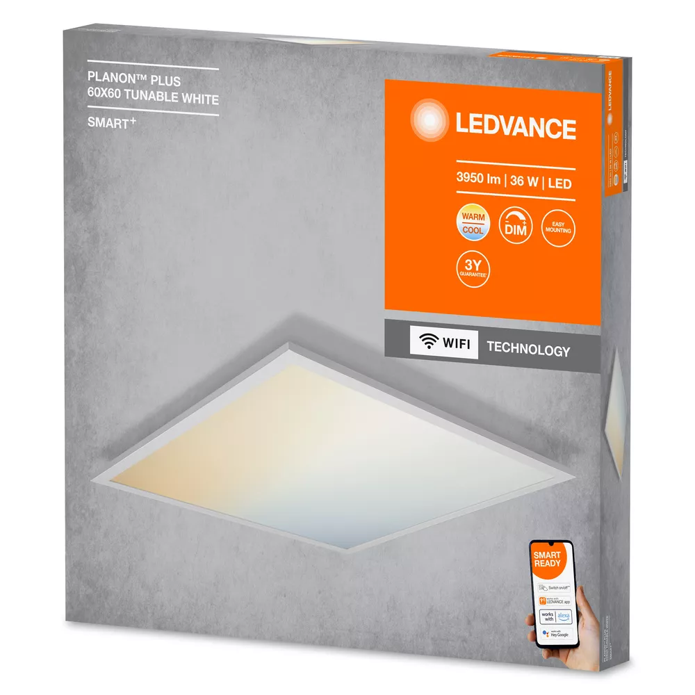 Oprawy panelowe z technologią WiFi. Cechy produktu: Możliwość sterowania za pomocą aplikacji LEDVANCE SMART+ (z systemem Android co najmniej 8.0 lub iOS 14.0). Możliwość sterowania za pomocą głosu: Asystent Google lub Amazon Alexa. Ściemnialne. Regulacja temperatury barwowej światła za pomocą Tunable White: 3000…6500 K. Protokół sieciowy: WiFi. Zalety produktu: Łatwa i szybka instalacja. Obszary zastosowań: Zastosowania wewnętrzne. Kuchnie, salony, pokoje dziecięce i pokoje do pracy. Wyposażenie / Akcesoria: Wspornik montażowy w zestawie. Śruby i kołki montażowe dostarczone w zestawie. Sterowanie za pomocą aplikacji lub głosu wymaga kompatybilnego systemu sterowania domem inteligentnym. Do sterowania za pomocą aplikacji LEDVANCE SMART+ wymagany jest smartfon lub tablet (z systemem Android co najmniej 8.0 lub iOS 14.0). Porady dotyczące bezpieczeństwa: Wszystkie podłączenia elektryczne muszą być wykonane przez osobę wykwalifikowaną.. Uwaga, ryzyko porażenia prądem.. Sprawdź przydatność ściany i sufitu. Jeśli nie jesteś pewien, zasięgnij profesjonalnej porady..