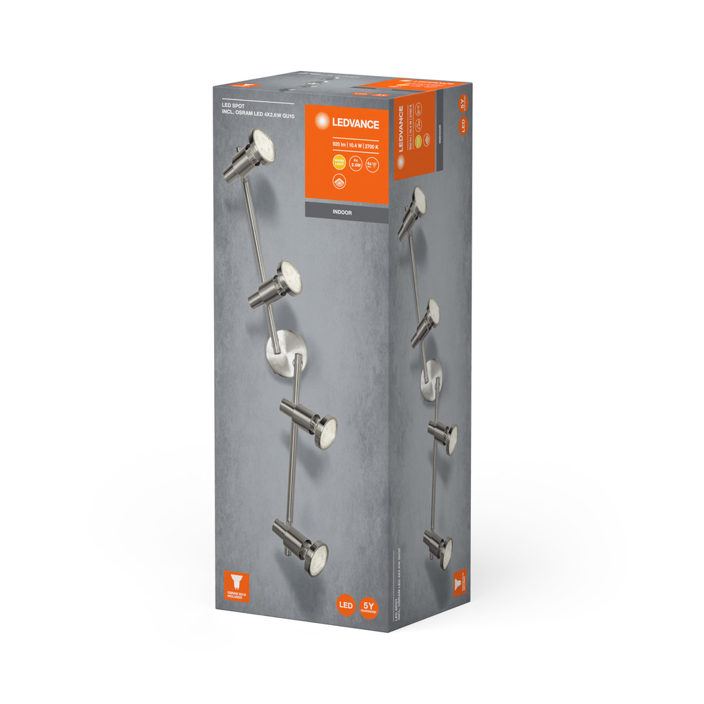 Oprawy sufitowe z elastycznymi reflektorami GU10. Cechy produktu: Rodzina opraw obejmuje pięć wersji z maksymalnie 6 głowicami oświetlenia punktowego. Powierzchnia obudowy wykonana ze szczotkowanego niklu. Regulowana oprawa. Zalety produktu: Aż do 90 % oszczędność energii w porównaniu z punktowymi oprawami halogenowymi. Ponadczasowa stylistyka. Uniwersalne rozwiązanie dzięki wymiennym lampom LED. Łatwy montaż. Obszary zastosowań: Zastosowania wewnętrzne. Korytarze, wejścia, klatki schodowe, pokoje dzienne, sutereny. Kuchnie, przestrzenie robocze. Montaż powierzchniowy na suficie i ścianach. Wyposażenie / Akcesoria: Wyposażony w LAMPĘ LED OSRAM EAN 4058075233263. Kompletne akcesoria do montażu i podłączenia w zestawie. Porady dotyczące bezpieczeństwa: Wszystkie podłączenia elektryczne muszą być wykonane przez osobę wykwalifikowaną.. Uwaga, ryzyko porażenia prądem.. Produkt w klasie ochrony I. Wszystkie przewodzące prąd, metalowe części obudowy, które mogą absorbować napięcie podczas pracy lub podczas konserwacji w przypadku awarii, muszą być stale PODŁĄCZONE do przewodu uziemiającego..