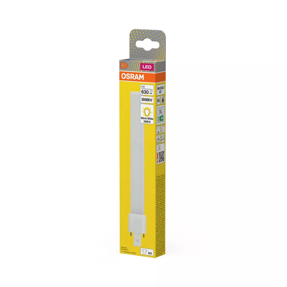 Zamiennik LED świetlówek jednotrzonkowych (CFLni) z 2-pinowym trzonkiem G23 do zasilania przez tradycyjny układ zasilający (dławik magnetyczny, CCG). Cechy produktu: Trwałość: do 30 000 h. Jednotrzonkowa, trzonek 2-kołkowy wtykowy G23. Stopień ochrony: IP20. Lampy niezawierające rtęci. Zalety produktu: Łatwa instalacja. Niskie zużycie energii. Łatwa wymiana lamp dzięki kompaktowej konstrukcji. Możliwe bezpośrednie zasilanie z sieci 230 V AC. Obszary zastosowań: Supermarkety i domy towarowe. Przejścia i korytarze. Hotele, restauracje. Porady dotyczące bezpieczeństwa: Nadaje się do zasilania w układzie szeregowym.. Zakres temperatury roboczej DULUX LED jest ograniczony. W przypadku wątpliwości co do przydatności aplikacji, przed instalacją należy zmierzyć temperaturę Tc na produkcie.. Wszystkie podłączenia elektryczne muszą być wykonane przez osobę wykwalifikowaną.. Nie nadaje się do oświetlenia awaryjnego.. Nie dotykaj lampy, jeśli jest stłuczona.. Nie wolno używać, jeśli zewnętrzne źródło światła jest uszkodzone..