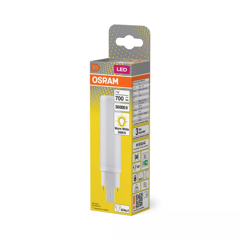 Zamiennik LED świetlówek jednotrzonkowych (CFLni) z 4-pinowym trzonkiem G24q do zasilania przez statecznik elektroniczny . Cechy produktu: Jednotrzonkowa, trzonek 4-kołkowy wtykowy G24q. Obrotowy trzonek wokół osi pionowej (± 90°). Trwałość: do 30 000 h. Stopień ochrony: IP20. Lampy niezawierające rtęci. Zalety produktu: Łatwa instalacja. Niskie zużycie energii. Łatwa wymiana lamp dzięki kompaktowej konstrukcji. Możliwe bezpośrednie zasilanie z sieci 230 V AC. Obszary zastosowań: Supermarkety i domy towarowe. Przejścia i korytarze. Hotele, restauracje. Porady dotyczące bezpieczeństwa: Nieodpowiednie do pracy z konwencjonalnymi statecznikami.. Zakres temperatury roboczej DULUX LED jest ograniczony. W przypadku wątpliwości co do przydatności aplikacji, przed instalacją należy zmierzyć temperaturę Tc na produkcie.. Wszystkie podłączenia elektryczne muszą być wykonane przez osobę wykwalifikowaną.. Nie nadaje się do oświetlenia awaryjnego.. Nie dotykaj lampy, jeśli jest stłuczona.. Nie wolno używać, jeśli zewnętrzne źródło światła jest uszkodzone..