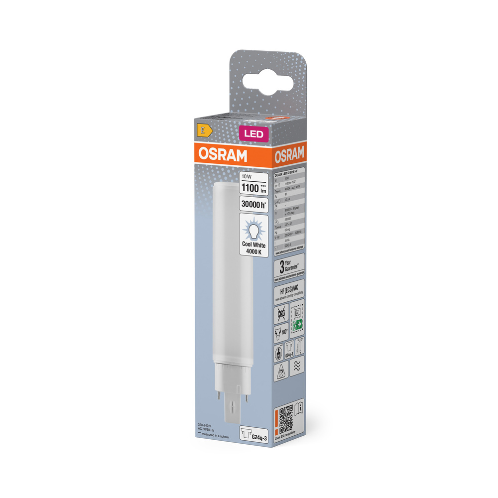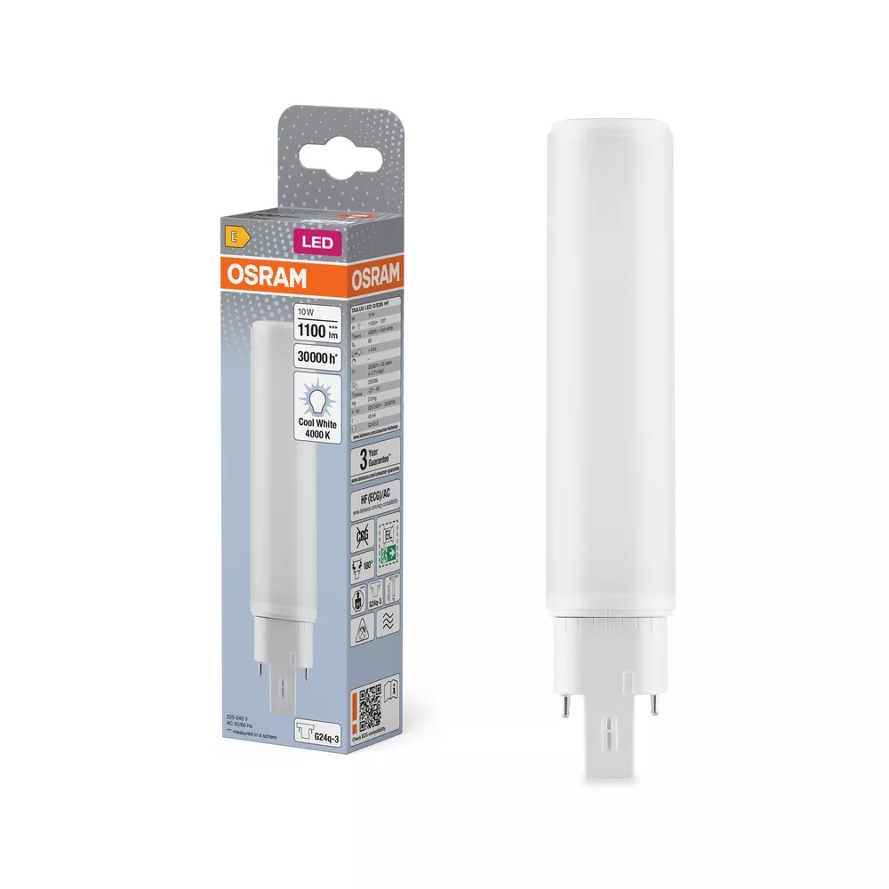 Zamiennik LED świetlówek jednotrzonkowych (CFLni) z 4-pinowym trzonkiem G24q do zasilania przez statecznik elektroniczny . Cechy produktu: Jednotrzonkowa, trzonek 4-kołkowy wtykowy G24q. Obrotowy trzonek wokół osi pionowej (± 90°). Trwałość: do 30 000 h. Stopień ochrony: IP20. Lampy niezawierające rtęci. Zalety produktu: Łatwa instalacja. Niskie zużycie energii. Łatwa wymiana lamp dzięki kompaktowej konstrukcji. Możliwe bezpośrednie zasilanie z sieci 230 V AC. Obszary zastosowań: Supermarkety i domy towarowe. Przejścia i korytarze. Hotele, restauracje. Porady dotyczące bezpieczeństwa: Nieodpowiednie do pracy z konwencjonalnymi statecznikami.. Zakres temperatury roboczej DULUX LED jest ograniczony. W przypadku wątpliwości co do przydatności aplikacji, przed instalacją należy zmierzyć temperaturę Tc na produkcie.. Wszystkie podłączenia elektryczne muszą być wykonane przez osobę wykwalifikowaną.. Nie nadaje się do oświetlenia awaryjnego.. Nie dotykaj lampy, jeśli jest stłuczona.. Nie wolno używać, jeśli zewnętrzne źródło światła jest uszkodzone..