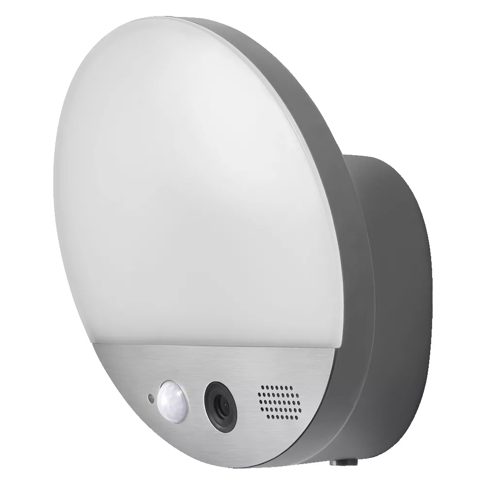 Okrągła oprawa ścienna ze zintegrowaną kamerą, głośnikiem, czujnikiem ruchu i światła. Cechy produktu: Ściemnialne. Temperatura barwowa: 3000 K (Warm White - ciepłobiała). Stopień ochrony: IP44. Kamera HD. Wbudowany programowalny czujnik światła. Strumień świetlny: 950 lm. Możliwość sterowania za pomocą aplikacji SMART+ (z systemem Android w wersji 8.0 lub iOS w wersji 14.0). Zalety produktu: Łatwa i szybka instalacja. Zwiększone poczucie bezpieczeństwa dzięki wysokiej jasności. Obszary zastosowań: Garaże. Strefy wejściowe. Zastosowania zewnętrzne (IP44). Wyposażenie / Akcesoria: Kompletne akcesoria do montażu i podłączenia w zestawie. Do sterowania za pomocą aplikacji SMART+ wymagany jest smartfon lub tablet (z systemem Android minimum 8.0 lub iOS 14.0). Porady dotyczące bezpieczeństwa: Wszystkie podłączenia elektryczne muszą być wykonane przez osobę wykwalifikowaną.. Uwaga, ryzyko porażenia prądem.. Sprawdź przydatność ściany i sufitu. Jeśli nie jesteś pewien, zasięgnij profesjonalnej porady..
