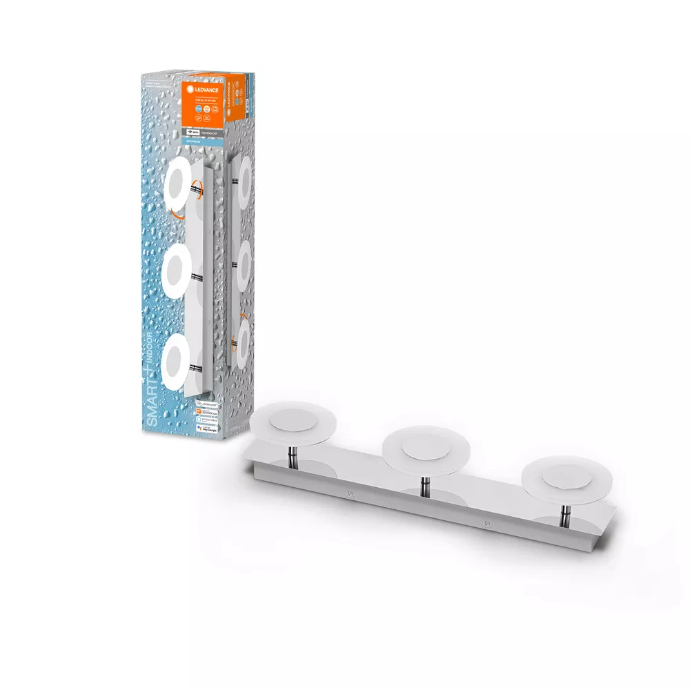 Inteligentna dekoracyjna oprawa sufitowa i ścienna do łazienki z technologią Wi-Fi IP44 TW z możliwością ściemniania. Cechy produktu: Stopień ochrony: IP44. Możliwość sterowania za pomocą głosu: Asystent Google lub Amazon Alexa. Regulacja temperatury barwowej światła za pomocą Tunable White: 3000…6500 K. Ściemnialne. Protokół sieciowy: WiFi. Możliwość sterowania za pomocą aplikacji SMART+ (z systemem Android w wersji 8.0 lub iOS w wersji 14.0). Zalety produktu: Łatwa i szybka instalacja. Sterowalny. Obszary zastosowań: Łazienki. Wyposażenie / Akcesoria: Wspornik montażowy w zestawie. Śruby i kołki montażowe dostarczone w zestawie. Sterowanie za pomocą aplikacji lub głosu wymaga kompatybilnego systemu sterowania domem inteligentnym. Do sterowania za pomocą aplikacji SMART+ wymagany jest smartfon lub tablet (z systemem Android minimum 8.0 lub iOS 14.0). Porady dotyczące bezpieczeństwa: Wszystkie podłączenia elektryczne muszą być wykonane przez osobę wykwalifikowaną.. Uwaga, ryzyko porażenia prądem.. Sprawdź przydatność ściany i sufitu. Jeśli nie jesteś pewien, zasięgnij profesjonalnej porady..