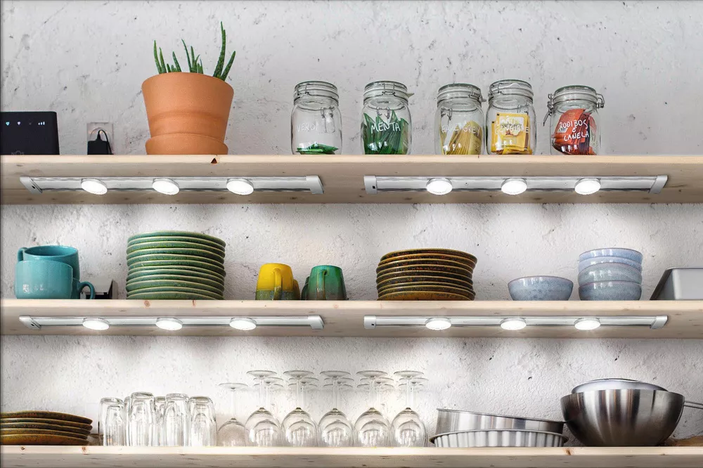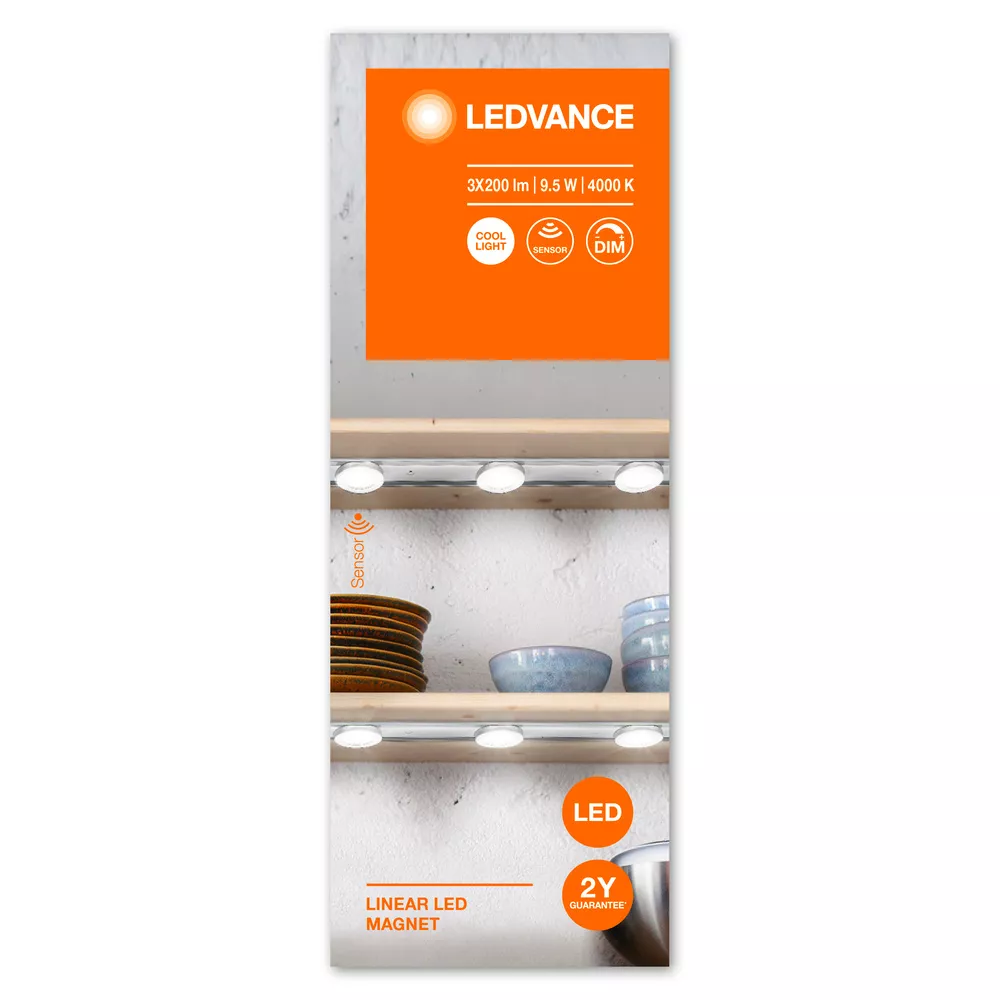 Płaskie oświetlenie podszafkowe, szyna magnetyczna do elastycznego montażu punktowego. Cechy produktu: Temperatura barwowa: 4000 K. Zalety produktu: Łatwe i szybkie podłączenie szeregowe dzięki prostemu systemowi wtyczek. Przejrzyste, nowoczesne wzornictwo. Obszary zastosowań: Oświetlenie pod szafkami. Eksploatacja tylko w pomieszczeniach. Oświetlenie półek i oświetlenie podszafkowe. Kuchnie, przestrzenie robocze. Półki. Wyposażenie / Akcesoria: Kompletne akcesoria do montażu i podłączenia w zestawie. Porady dotyczące bezpieczeństwa: Ten produkt nie jest zabawką. Nie powinien być pozostawiany bez nadzoru w rękach dzieci ani obsługiwany przez dzieci.. Nie jest przeznaczony do zastępowania tradycyjnego oświetlenia w gospodarstwach domowych.. Aby ograniczyć ryzyko uduszenia, elastyczne przewody PODŁĄCZONE do tej oprawy należy solidnie przymocować do ściany, jeśli znajdują się w zasięgu ręki..