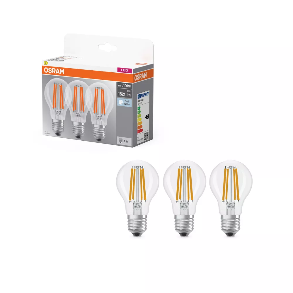 Lampy LED, klasyczny kształt żarówki. Cechy produktu: Profesjonalne lampy dla napięcia sieciowego. Brak możliwości regulacji strumienia świetlnego. Trzonek: E27, B22d. Lampy niezawierające rtęci. Zalety produktu: Niższe zużycie energii w porównaniu do lamp żarowych lub halogenowych. Odporność na wstrząsy i drgania dzięki technologii LED. Brak promieniowania UV i podczerwonego w wiązce światła. Natychmiast 100 % światła, bez czasu nagrzewania. Łatwy montaż zamiast zwykłych żarówek. Niskie obciążenie cieplne (w porównaniu ze standardowym produktem referencyjnym). Obszary zastosowań: Zastosowania domowe. Oświetlenie ogólne. Do użytku na zewnątrz tylko w odpowiednich oprawach zewnętrznych. Porady dotyczące bezpieczeństwa: Nie dotykaj lampy, jeśli jest stłuczona.. Nie wolno używać, jeśli zewnętrzne źródło światła jest uszkodzone..
