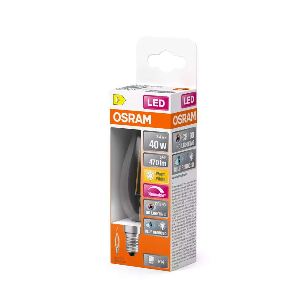Ściemnialne lampy LED, kształt żarówki świecowej. Cechy produktu: Lampy LED dla napięcia sieciowego. Kąt wiązki światła: do 300°. Ściemnialne. Wskaźnik oddawania barw Ra: ≥ 90. Zalety produktu: Lampy wyposażone w innowacyjną technologię „włókien” LED. Wygląd, wymiary i strumień świetlny porównywalne z żarówkami halogenowymi. Widmo światła naturalnego z doskonałym wskaźnikiem oddawania barw Ra > 90. Znacznie zmniejszony zakres niebieskiego światła. Poprawiony komfort widzenia i zmniejszone zmęczenie wzroku. Niższe zużycie energii w porównaniu do lamp żarowych lub halogenowych. Natychmiast 100 % światła, bez czasu nagrzewania. Niskie tętnienie światła. Obszary zastosowań: Doskonałe rozwiązanie do instalacji dekoracyjnych. Zastosowania domowe. Oświetlenie ogólne. Do użytku na zewnątrz tylko w odpowiednich oprawach zewnętrznych. Porady dotyczące bezpieczeństwa: Nie dotykaj lampy, jeśli jest stłuczona.. Nie wolno używać, jeśli zewnętrzne źródło światła jest uszkodzone..