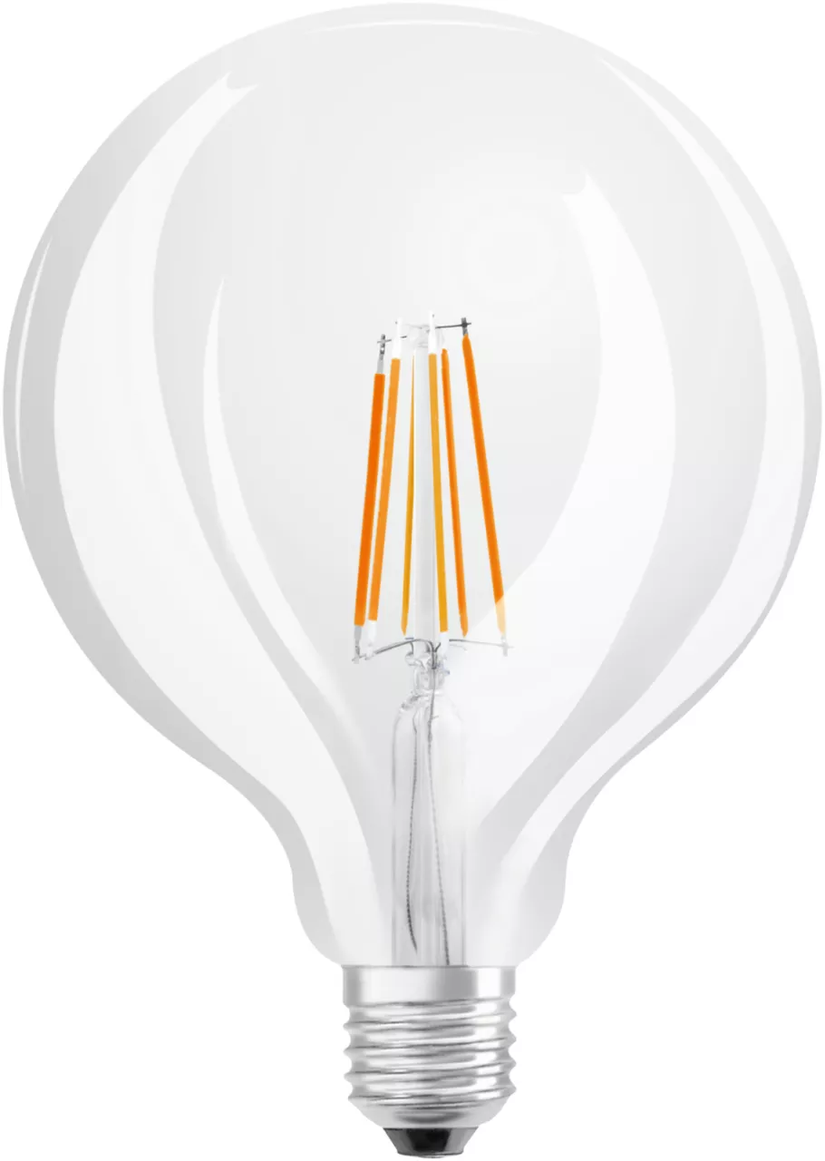 Ściemnialne lampy LED, klasyczny kształt żarówki kulistej. Cechy produktu: Lampy LED dla napięcia sieciowego. Kąt wiązki światła: do 300°. Ściemnialne. Wskaźnik oddawania barw Ra: ≥ 90. Zalety produktu: Lampy wyposażone w innowacyjną technologię „włókien” LED. Wygląd, wymiary i strumień świetlny porównywalne z żarówkami halogenowymi. Widmo światła naturalnego z doskonałym wskaźnikiem oddawania barw Ra > 90. Znacznie zmniejszony zakres niebieskiego światła. Poprawiony komfort widzenia i zmniejszone zmęczenie wzroku. Niższe zużycie energii w porównaniu do lamp żarowych lub halogenowych. Natychmiast 100 % światła, bez czasu nagrzewania. Niskie tętnienie światła. Obszary zastosowań: Doskonałe rozwiązanie do instalacji dekoracyjnych. Zastosowania domowe. Oświetlenie ogólne. Do użytku na zewnątrz tylko w odpowiednich oprawach zewnętrznych. Porady dotyczące bezpieczeństwa: Nie dotykaj lampy, jeśli jest stłuczona.. Nie wolno używać, jeśli zewnętrzne źródło światła jest uszkodzone..