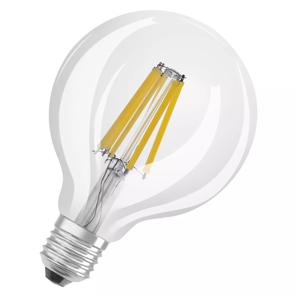 Ściemnialne lampy LED, klasyczny kształt żarówki kulistej. Cechy produktu: Lampy LED dla napięcia sieciowego. Kąt wiązki światła: do 300°. Ściemnialne. Wskaźnik oddawania barw Ra: ≥ 90. Zalety produktu: Lampy wyposażone w innowacyjną technologię „włókien” LED. Wygląd, wymiary i strumień świetlny porównywalne z żarówkami halogenowymi. Widmo światła naturalnego z doskonałym wskaźnikiem oddawania barw Ra > 90. Znacznie zmniejszony zakres niebieskiego światła. Poprawiony komfort widzenia i zmniejszone zmęczenie wzroku. Niższe zużycie energii w porównaniu do lamp żarowych lub halogenowych. Natychmiast 100 % światła, bez czasu nagrzewania. Niskie tętnienie światła. Obszary zastosowań: Doskonałe rozwiązanie do instalacji dekoracyjnych. Zastosowania domowe. Oświetlenie ogólne. Do użytku na zewnątrz tylko w odpowiednich oprawach zewnętrznych. Porady dotyczące bezpieczeństwa: Nie dotykaj lampy, jeśli jest stłuczona.. Nie wolno używać, jeśli zewnętrzne źródło światła jest uszkodzone..