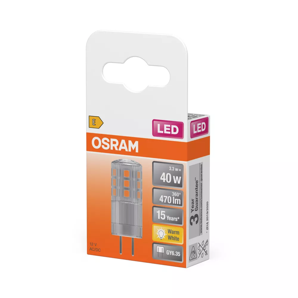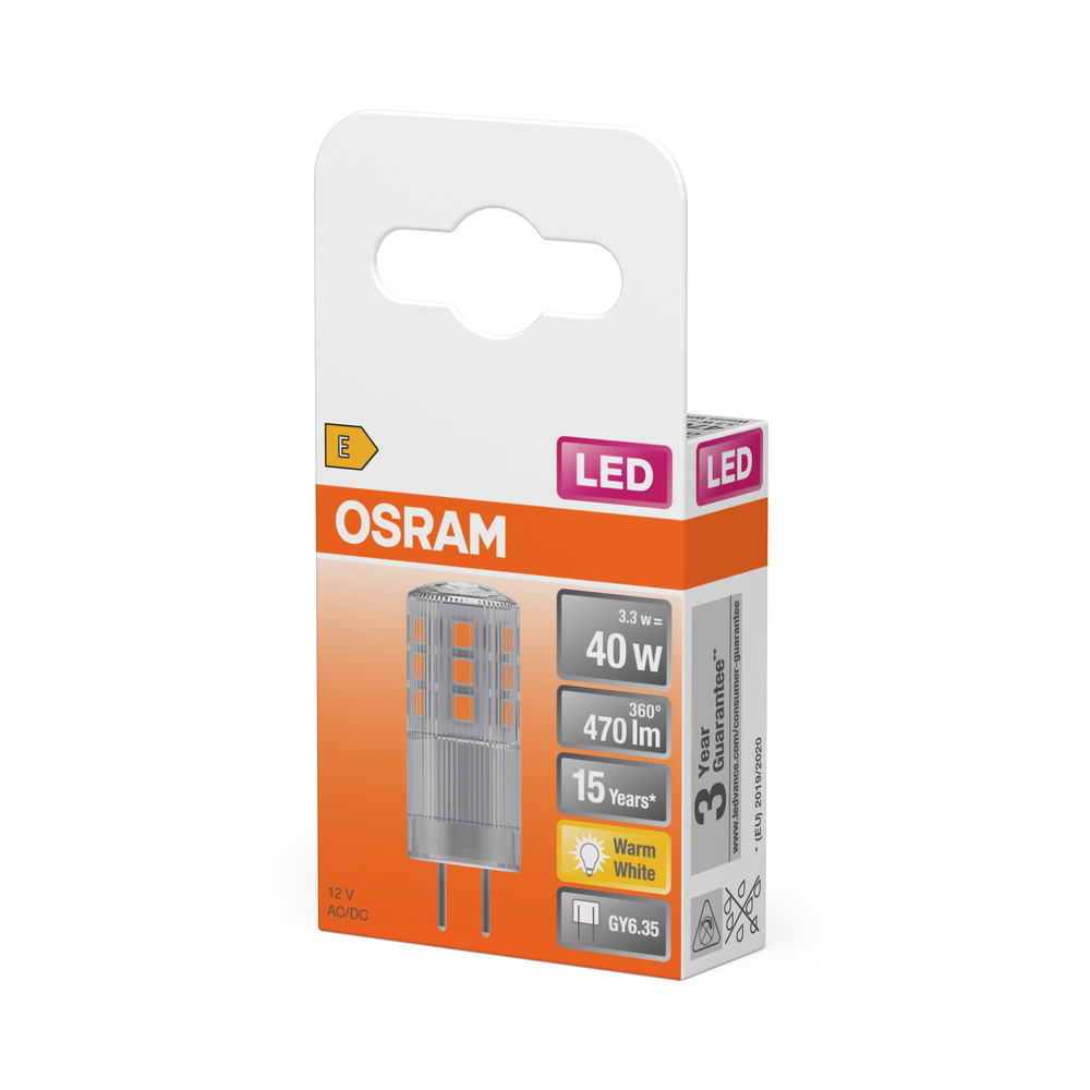 Niskonapięciowe lampy LED 12 V z trzonkiem kołkowym. Cechy produktu: Zgodność z wieloma konwencjonalnymi i elektronicznymi zasilaczami (patrz również compatibility list). Zamiennik LED dla niskonapięciowych żarówek halogenowych. Trzonek: G4, GY6.35. Zalety produktu: Praca alternatywnie z zasilaniem prądem stałym lub przemiennym. Równomierny rozsył światła we wszystkich kierunkach. Idealne do zastosowania dekoracyjnego oraz do eksploatacji bez oprawy. Długa trwałość do 15 000 godzin. 3-letnia gwarancja. Niższe zużycie energii w porównaniu do lamp żarowych lub halogenowych. Obszary zastosowań: Zastosowania dekoracyjne. Nastrojowe oświetlenie akcentujące w całym domu. Do użytku na zewnątrz tylko w odpowiednich oprawach zewnętrznych. Porady dotyczące bezpieczeństwa: Nie dotykaj lampy, jeśli jest stłuczona.. Nie wolno używać, jeśli zewnętrzne źródło światła jest uszkodzone.. Aby zapewnić pełną wydajność oświetlenia i trwałość produktu, zalecane jest demontaż szyby lub osłony oprawy oświetleniowej..
