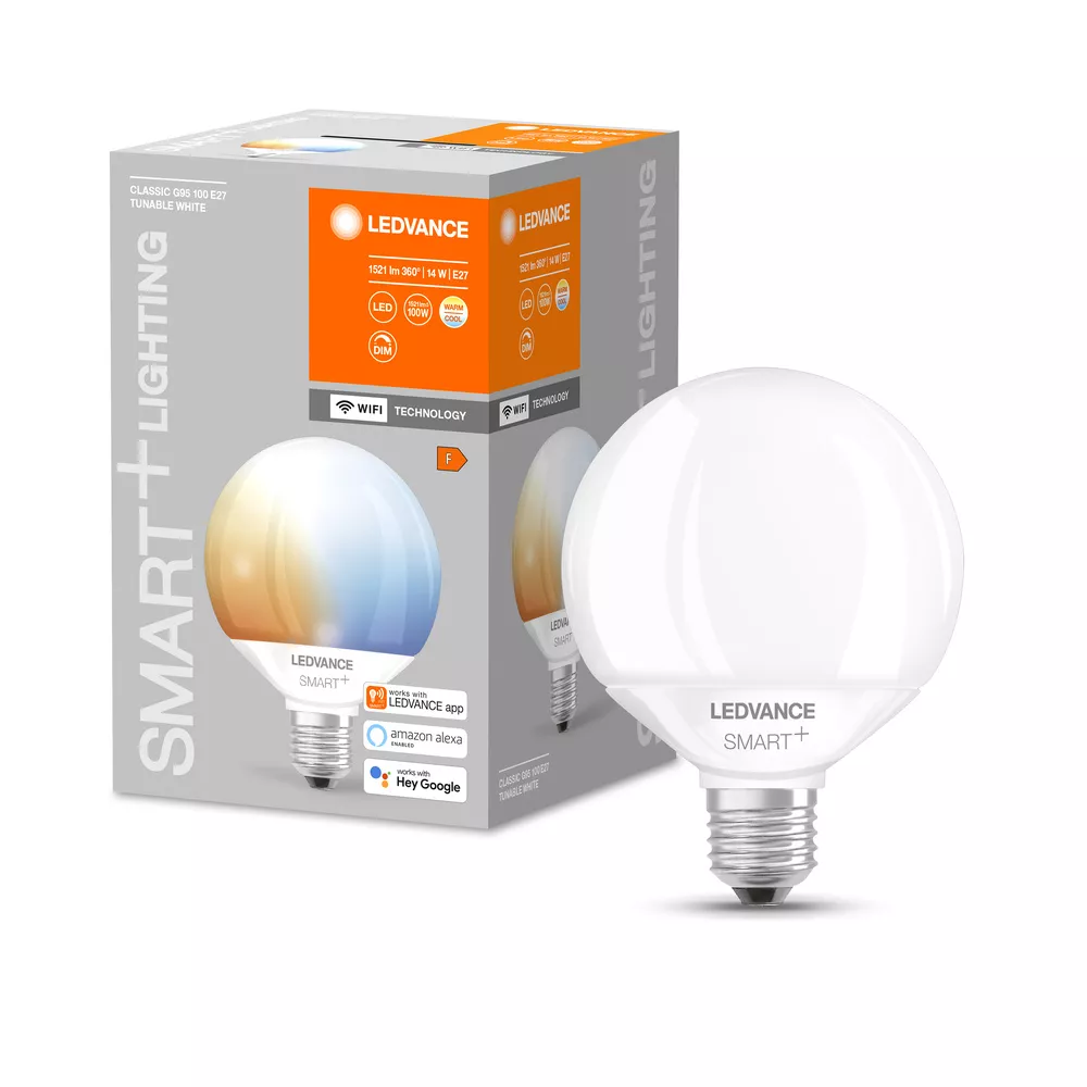 SMART+ LAMPA CLASSIC GLOBE Z TECHNOLOGIĄ WIFI . Cechy produktu: Możliwość sterowania za pomocą aplikacji LEDVANCE SMART+ (z systemem Android co najmniej 8.0 lub iOS 14.0). Możliwość sterowania przez Asystenta Google i Amazon Alexa. Protokół sieciowy: WiFi. Regulacja temperatury barwowej światła: 2700…6500 K. Ściemnialne. Trwałość do 15 000 h. Zalety produktu: Sterowanie bezprzewodowe za pomocą aplikacji. Łatwy montaż i użycie. Nie zawiera rtęci. Niższe zużycie energii w porównaniu do lamp żarowych lub halogenowych. Obszary zastosowań: Oświetlenie ogólne. Pomieszczenia mieszkalne. Zastosowania profesjonalne (hotele, bary, butiki itp.). Do użytku na zewnątrz tylko w odpowiednich oprawach zewnętrznych. Wyposażenie / Akcesoria: Do sterowania za pomocą aplikacji LEDVANCE SMART+ wymagany jest smartfon lub tablet (z systemem Android co najmniej 8.0 lub iOS 14.0). Porady dotyczące bezpieczeństwa: Nie dotykaj lampy, jeśli jest stłuczona.. Nie wolno używać, jeśli zewnętrzne źródło światła jest uszkodzone..