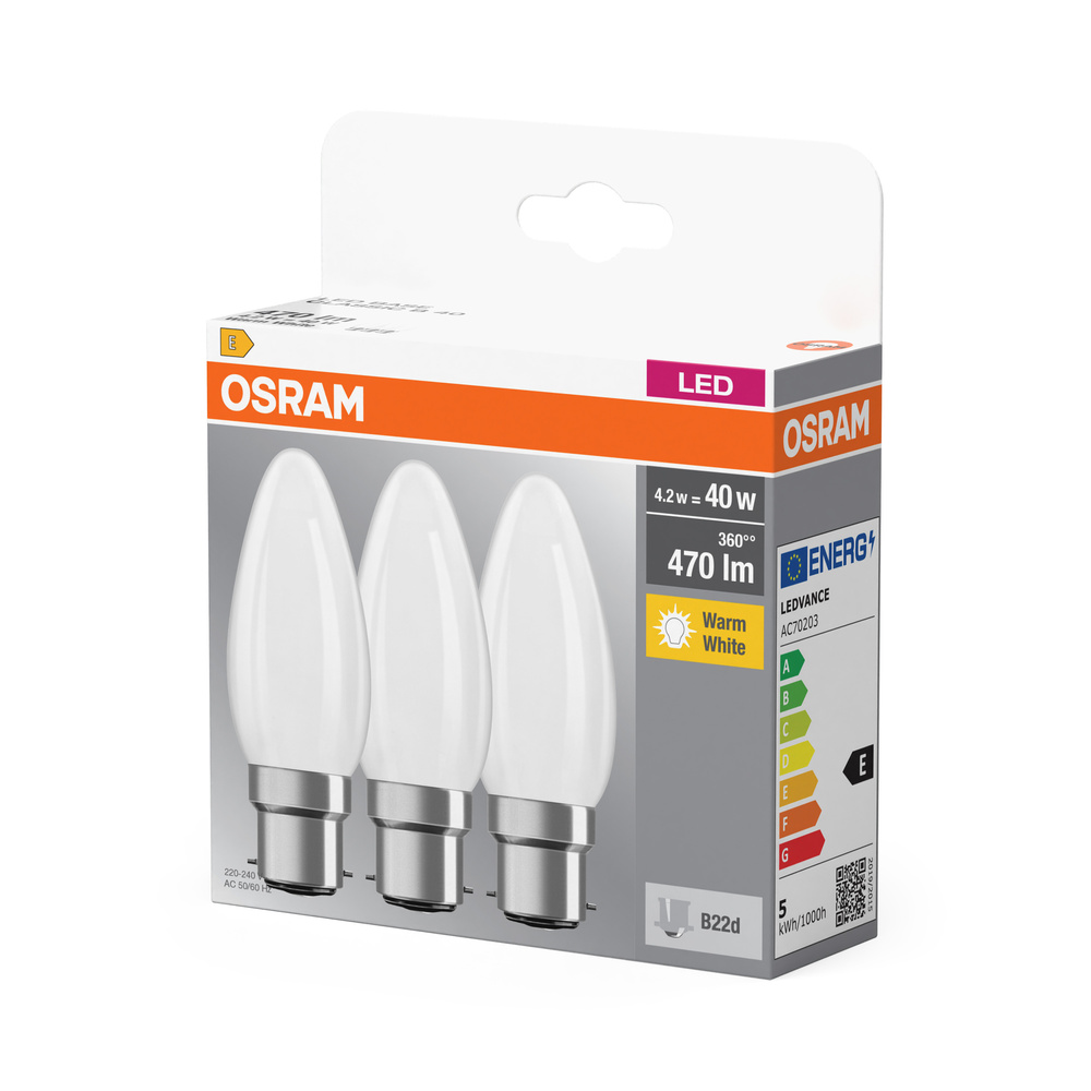 Lampy LED w kształcie klasycznej żarówki świecowej. Cechy produktu: Profesjonalne lampy dla napięcia sieciowego. Nieprzystosowane do pracy z regulatorami. Dobre oddawanie barw (R<sub>a</sub> ≥ 80) i stabilność braw przez cały czas eksploatacji lampy. Trzonek: E14, B22d. Lampy niezawierające rtęci. Zalety produktu: Niskie obciążenie cieplne (w porównaniu ze standardowym produktem referencyjnym). Niższe zużycie energii w porównaniu do lamp żarowych lub halogenowych. Odporność na wstrząsy i drgania dzięki technologii LED. Brak promieniowania UV i podczerwonego w wiązce światła. Natychmiast 100 % światła, bez czasu nagrzewania. Bezpośrednio zastępuje zwykłe żarówki. Obszary zastosowań: Oświetlenie ogólne. Zastosowania domowe. Żyrandole. Do użytku na zewnątrz tylko w odpowiednich oprawach zewnętrznych. Porady dotyczące bezpieczeństwa: Nie dotykaj lampy, jeśli jest stłuczona.. Nie wolno używać, jeśli zewnętrzne źródło światła jest  uszkodzone..