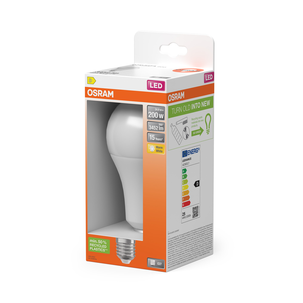 Lampy LED z tworzywa sztucznego pochodzącego z recyklingu. Cechy produktu: LED zamienniki tradycyjnych żarówek. Lampy niezawierające rtęci. Zalety produktu: Niższe zużycie energii w porównaniu do lamp żarowych lub halogenowych. Prosty w użyciu zamiennik żarówek klasycznych dzięki kompaktowej konstrukcji. Natychmiast 100 % światła, bez czasu nagrzewania. Obszary zastosowań: Zastosowania domowe. Oświetlenie ogólne. Do użytku na zewnątrz tylko w odpowiednich oprawach zewnętrznych. Porady dotyczące bezpieczeństwa: Nie dotykaj lampy, jeśli jest stłuczona.. Nie wolno używać, jeśli zewnętrzne źródło światła jest uszkodzone..