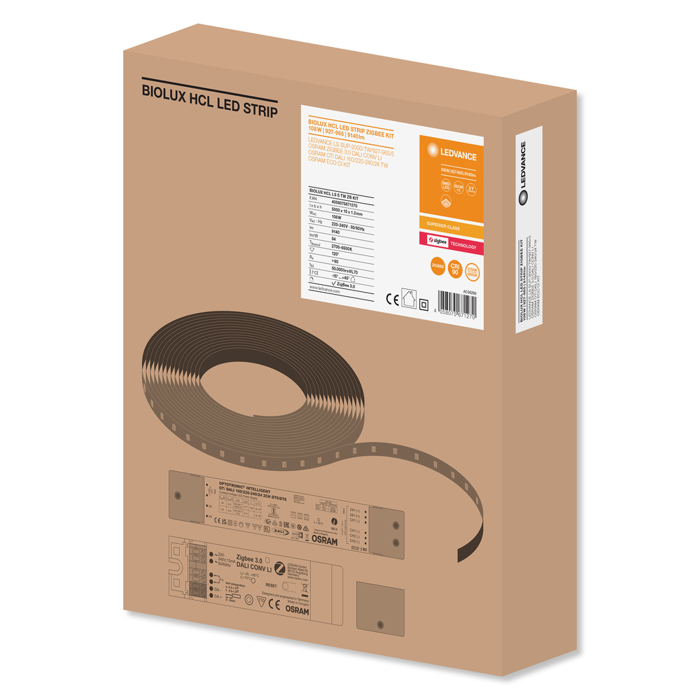 Zestaw pasków LED, Tunable White, Zigbee. Cechy produktu: Oprawy Tunable White z certyfikatem Zigbee 3.0 — paski LED do łatwej integracji z systemami partnerskimi. Gotowy do podłączenia do jednostki sterującej BIOLUX HCL i VIVARES ZIGBEE. Regulacja temperatury barwowej światła za pomocą pilota w zakresie Tunable White: 2700…6500 K. Bezprzewodowa komunikacja między modułem sterującym i oprawami oświetleniowymi za pomocą protokołu Zigbee. Bardzo wysoki wskaźnik oddawania barw Ra: > 90. Najmniejsza jednostka podziału : 100 mm. Zalety produktu: Zestaw z taśmą LED o długości 5 m, dopasowanym sterownikiem i adapterem Zigbee. Zestaw produktów ZB KIT: 1x Taśma LED Superior 2000 lm/m TW (4058075436084), sterownik OTi Dali 160 W/220-240/24 2CH DT6/8 (4062172177948); Konwerter Zigbee Dali (4062172044776) z odciążeniem ECO CI KIT (4008321392091). Zestaw produktów IP67 ZB KIT: 1x Taśma LED Superior 2000 lm/m TW (4058075436008), sterownik OTi Dali 160 W/220-240/24 2CH DT6/8 (4062172177948); Konwerter Zigbee Dali (4062172044776) z odciążeniem ECO CI KIT (4008321392091). JEDNOSTKA STERUJĄCA BIOLUX HCL do sterowania paskami LED, należy zamówić osobno (EAN 4058075308657). Dodatkowe akcesoria można znaleźć na stronie głównej LEDVANCE w kategorii produktów Taśmy LED. Umożliwia indywidualne rozwiązanie oświetleniowe w połączeniu z kompatybilnymi sterownikami oświetlenia Zigbee HCL. Biologicznie zoptymalizowane oświetlenie poprzez dostosowanie światła sztucznego do naturalnego światła dziennego. 5 lat gwarancji systemowej BIOLUX HCL w przypadku eksploatacji w ramach systemu BIOLUX HCL (jednostka sterująca BIOLUX HCL- - VIVARES ZIGBEE w połączeniu z oprawami BIOLUX HCL - paski LED BIOLUX HCL). Obszary zastosowań: Rozwiązanie oświetleniowe dla maksymalnie 40 opraw BIOLUX HCL — paski LED BIOLUX HCL połączone ze sterownikiem BIOLUX HCL. ZESTAW dostępny do zastosowań wewnętrznych lub zewnętrznych. Oświetlenie faset. Pokoje hotelowe i biurowe z małą ilością światła dziennego. Wyposażenie / Akcesoria: Aplikacja LEDVANCE BIOLUX wymagana tylko do uruchomienia systemu BIOLUX HCL (dostępna na Androida i iOS). Aplikacja LEDVANCE VIVARES do projektu, wymagana tylko do uruchomienia systemu VIVARES ZIGBEE (dostępna na Androida i iOS). Porady prawne: Korzystanie z aplikacji LEDVANCE BIOLUX- / VIVARES podlega wyłącznie warunkom użytkowania aplikacji LEDVANCE BIOLUX- - VIVARES, które są wyświetlane podczas instalacji aplikacji i są dostępne w aplikacji. Porady dotyczące bezpieczeństwa: Ważna uwaga dotycząca obsługi i zastrzeżenie prawne: