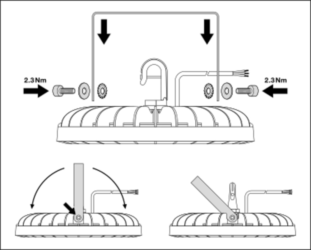 Oprawy oświetleniowe typu High Bay, skuteczność świetlna do 120 lm/W. Cechy produktu: Zakres temperatury pracy: -20…45 °C. Czarna aluminiowa obudowa, szkło hartowane. Opalizowana osłona. Stopień ochrony: IP65. Trwałość (L70): do 50 000 h. Wysoka skuteczność świetlna: do 120 lm/W. Zalety produktu: Nowoczesne, ekskluzywne wzornictwo. Oszczędność energii do 60 % w porównaniu z konwencjonalnymi oprawami oświetleniowymi typu High Bay. Zoptymalizowana masa i rozmiary dzięki kompaktowej konstrukcji. Obszary zastosowań: Bezpośredni zamiennik opraw oświetleniowych typu High Bay do lamp rtęciowych lub metalohalogenkowych. Domy towarowe. Hale logistyczne. Przemysł. Wysokie pomieszczenia (np.: centra handlowe, lotniska, budynki komercyjne, hole). Wyposażenie / Akcesoria: Dostępne zaciski. Dostępny reflektor.