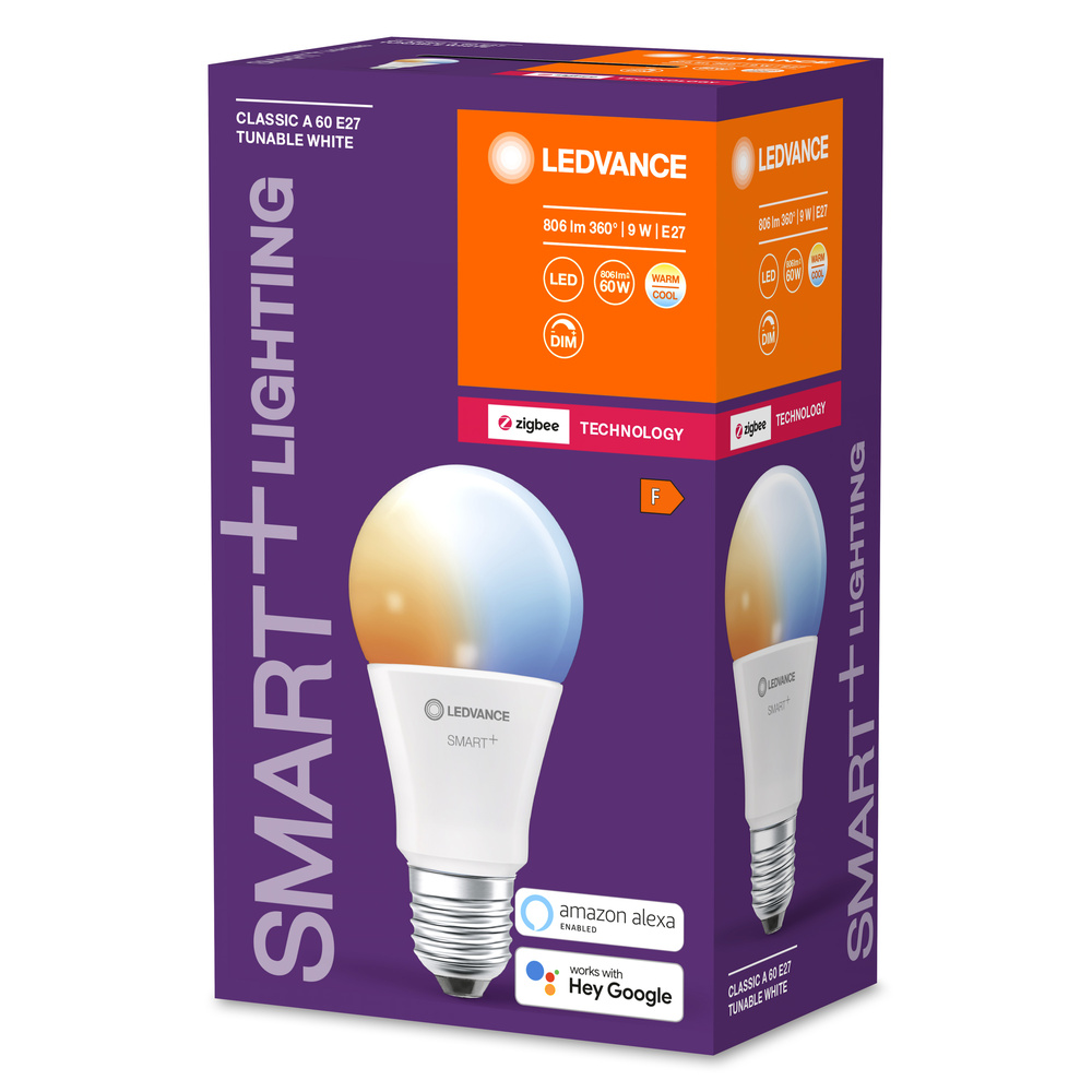 Kształt tradycyjnej żarówki, z technologią Zigbee. Cechy produktu: Możliwość sterowania za pomocą kompatybilnego systemu domu inteligentnego (bramka i aplikacja). Dostępne sterowanie głosowe: Asystent Google lub Amazon Alexa, w zależności od używanego systemu inteligentnego domu. Regulacja temperatury barwowej światła: 2700…6500 K. Protokół sieciowy: ZigBee 3.0. Ściemnialne. Trwałość: do 20 000 h. Do wykorzystania pełni możliwości potrzebne jest połączenie do kompatybilnego systemu sterowania inteligentnym domem (aplikacja i bramka). Zalety produktu: Sterowanie bezprzewodowe za pomocą aplikacji. Łatwy montaż i użycie. Nie zawiera rtęci. Niższe zużycie energii w porównaniu do lamp żarowych lub halogenowych. Obszary zastosowań: Oświetlenie ogólne. Pomieszczenia mieszkalne. Zastosowania profesjonalne (hotele, bary, butiki itp.). Do użytku na zewnątrz tylko w odpowiednich oprawach zewnętrznych. Porady dotyczące bezpieczeństwa: Nie dotykaj lampy, jeśli jest stłuczona.. Nie wolno używać, jeśli zewnętrzne źródło światła jest uszkodzone..