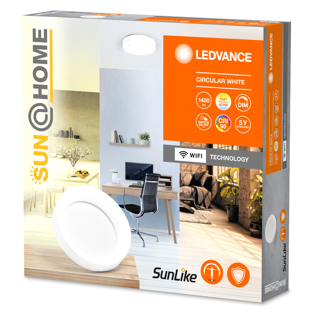 Oprawy sufitowe z technologią "Human Centric Lighting". Cechy produktu: Funkcja automatycznego biorytmu. Innowacyjne LED typu Fullspectrum SunLike, Ra 95. Diody SunLike z redukcją niebieskiego światła w widmie. Innowacyjna technologia powlekania opraw oświetleniowych zwalczająca drobnoustroje domowe i zapachy. Możliwość sterowania za pomocą aplikacji LEDVANCE SMART+ (z systemem Android co najmniej 8.0 lub iOS 14.0). Możliwość sterowania za pomocą głosu: Asystent Google lub Amazon Alexa. Regulowana temperatura barwowa światła za pomocą funkcji Tunable White: 2200…5000 K. Ściemnialne. Zalety produktu: Dostosowuje światło do Twojego Biorytmu: właściwe światło we właściwym czasie. Umożliwiają zwiększoną koncentrację i wydajność. Poprawa ogólnego poziomu aktywności i czujność w ciągu dnia. Poprawa rytmu i intensywność snu. Poprawa wygody widzenia. Umożliwia osiągnięcie wyższego poziomu czystości powietrza poprzez zabijanie zarazków i nieprzyjemnych zapachów. Równomierny rozsył strumienia świetlnego. Łatwa i szybka instalacja. Obszary zastosowań: Zastosowania wewnętrzne. Kuchnie, salony, pokoje dziecięce i pokoje do pracy. Wyposażenie / Akcesoria: Kompletne akcesoria do montażu i podłączenia w zestawie. Sterowanie za pomocą aplikacji lub głosu wymaga kompatybilnego systemu sterowania domem inteligentnym. Do sterowania za pomocą aplikacji LEDVANCE SMART+ wymagany jest smartfon lub tablet (z systemem Android co najmniej 8.0 lub iOS 14.0). Porady dotyczące bezpieczeństwa: Wszystkie podłączenia elektryczne muszą być wykonane przez osobę wykwalifikowaną.. Uwaga, ryzyko porażenia prądem.. Sprawdź przydatność ściany i sufitu. Jeśli nie jesteś pewien, zasięgnij profesjonalnej porady..