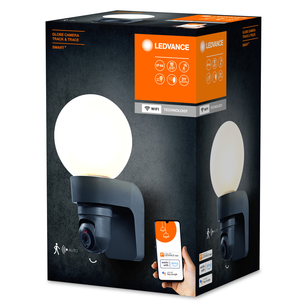 Outdoor Smart Camera Globe Track & Trace z oprawką E27. Cechy produktu: Możliwość sterowania za pomocą głosu: Asystent Google lub Amazon Alexa. Wbudowany głośnik i syrena alarmowa. Kamera HD. Protokół sieciowy: WiFi. Stopień ochrony: IP44. Kamera ma funkcję śledzenia, tak aby śledzić ruchy ludzi. aparat 3 MP. Rozmawiaj z telefonu komórkowego do kamery. Automatyczny tryb nocny. Czujnik ruchu z harmonogramem aktywności. Automatyczne nagrywanie ruchów (wymagana karta SD). Możliwość sterowania za pomocą aplikacji SMART+ (z systemem Android w wersji 8.0 lub iOS w wersji 14.0). Zalety produktu: Łatwa i szybka instalacja. Zwiększone poczucie bezpieczeństwa dzięki wysokiej jasności. Zarejestrowane dane są zapisywane na karcie pamięci urządzenia lub w chmurze. Materiały wysokiej jakości. Obszary zastosowań: Zastosowania zewnętrzne (IP44). Garaże. Strefy wejściowe. Wyposażenie / Akcesoria: Źródła światła nie są dostarczane w zestawie. Śruby i kołki montażowe dostarczone w zestawie. Brak karty SD. Kompatybilny z typem karty SD (SD/SDHC/SDXC). Zalecana klasa SD 120-160 MB/s. Minimalna pojemność karty 8 GB/maksymalnie 128 GB. Do sterowania za pomocą aplikacji SMART+ wymagany jest smartfon lub tablet (z systemem Android minimum 8.0 lub iOS 14.0). Porady dotyczące bezpieczeństwa: Wszystkie podłączenia elektryczne muszą być wykonane przez osobę wykwalifikowaną.. Uwaga, ryzyko porażenia prądem.. Sprawdź przydatność ściany i sufitu. Jeśli nie jesteś pewien, zasięgnij profesjonalnej porady..