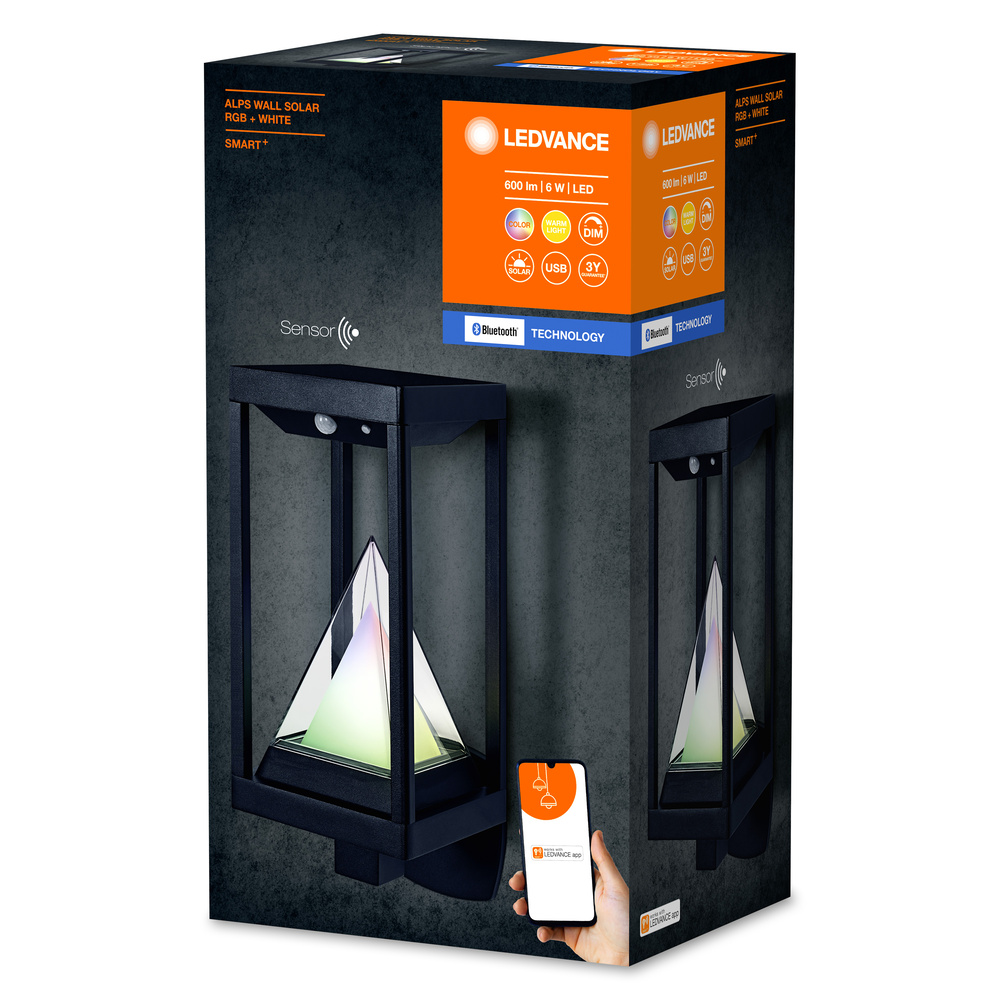 Outdoor Smart Solar Alps Wall sensor. Cechy produktu: Oprawy oświetleniowe LED do użytku zewnętrznego zasilane energią słoneczną. Sterowanie kolorami RGB. Ściemnialne. Temperatura barwowa: 3000 K (Warm White - ciepłobiała). Protokół sieciowy: Bluetooth. Stopień ochrony: IP44. Ładowanie baterii poprzez panel słoneczny. Możliwość sterowania za pomocą aplikacji SMART+ (z systemem Android w wersji 8.0 lub iOS w wersji 14.0). Zalety produktu: Łatwa i szybka instalacja. Barwne oświetlenie ogrodowe i inteligentne opcje sterowania. Oświetlenie zgodne z zapotrzebowaniem i oszczędność energii zapewnia czujnik ruchu i światła. Wykorzystanie wielobarwnego, ciepłobiałego i zimnobiałego światła do tworzenia różnego rodzaju scenerii oświetleniowych. Łączy funkcjonalność oświetlenia ogólnego i nastrojowego. Materiały wysokiej jakości. Obszary zastosowań: Oświetlenie ogólne. Zastosowania zewnętrzne (IP44). Ogrody. Patia, balkony. Elewacje budynków. Wyposażenie / Akcesoria: Sterowanie za pomocą aplikacji lub głosu wymaga kompatybilnego systemu sterowania domem inteligentnym. Śruby i kołki montażowe dostarczone w zestawie. W zestawie znajduje się zasilacz. Do sterowania za pomocą aplikacji SMART+ wymagany jest smartfon lub tablet (z systemem Android minimum 8.0 lub iOS 14.0). Porady dotyczące bezpieczeństwa: Jeśli komora baterii (jeśli dotyczy) nie zamyka się bezpiecznie, zaprzestań używania produktu i trzymaj go z dala od dzieci. Jeśli podejrzewasz, że baterie mogły zostać połknięte lub umieszczone w jakiejkolwiek części ciała, natychmiast zwróć się o pomoc lekarską.. Prosimy unikać: Maksymalna temperatura otoczenia: +35 °C. Wymiana baterii na nieprawidłowy typ, który może obejść zabezpieczenie (na przykład w przypadku niektórych typów baterii litowych). Wysokość podczas pracy: 2000 m. Utylizacja baterii w ogniu lub gorącym piekarniku, lub mechaniczne zgniatanie lub cięcie baterii, co może spowodować wybuch.. Sprawdź przydatność ściany i sufitu. Jeśli nie jesteś pewien, zasięgnij profesjonalnej porady..