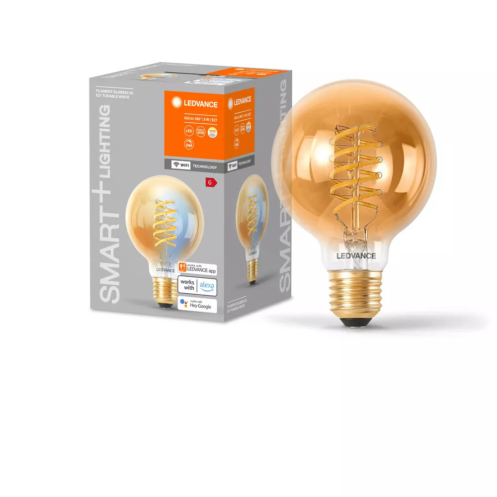 SMART+ Klasyczne lampy LED z technologią WiFi. Cechy produktu: Możliwość sterowania za pomocą aplikacji LEDVANCE SMART+ (z systemem Android co najmniej 8.0 lub iOS 14.0). Możliwość sterowania przez Asystenta Google i Amazon Alexa. Protokół sieciowy: WiFi. Regulowana barwa światła za pomocą Tunable White: od ciepłej, komfortowej bieli do zimnej bieli (2200 K … 5000 K). Ściemnialne. Trwałość do 15 000 h. Zalety produktu: Sterowanie bezprzewodowe za pomocą aplikacji. Łatwy montaż i użycie. Nie zawiera rtęci. Niższe zużycie energii w porównaniu do lamp żarowych lub halogenowych. Obszary zastosowań: Oświetlenie ogólne. Pomieszczenia mieszkalne. Zastosowania profesjonalne (hotele, bary, butiki itp.). Zastosowania zewnętrzne - tylko w odpowiednich oprawach. Wyposażenie / Akcesoria: Do sterowania za pomocą aplikacji LEDVANCE SMART+ wymagany jest smartfon lub tablet (z systemem Android co najmniej 8.0 lub iOS 14.0). Porady dotyczące bezpieczeństwa: Nie dotykaj lampy, jeśli jest stłuczona.. Nie wolno używać, jeśli zewnętrzne źródło światła jest uszkodzone..