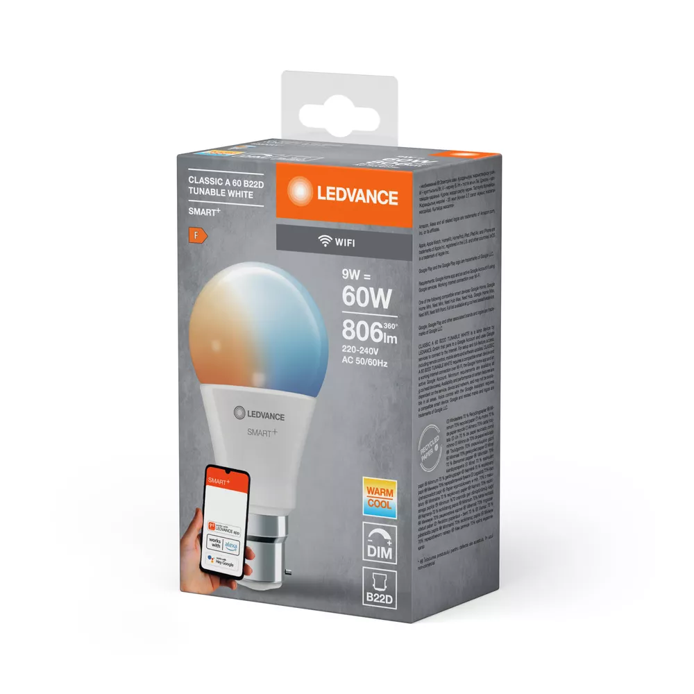 Klasyczny kształt żarówki z technologią WiFi. Cechy produktu: Możliwość sterowania za pomocą aplikacji LEDVANCE SMART+ (z systemem Android co najmniej 8.0 lub iOS 14.0). Możliwość sterowania przez Asystenta Google i Amazon Alexa. Protokół sieciowy: WiFi. Regulacja temperatury barwowej światła: 2700…6500 K. Ściemnialne. Trwałość: do 20 000 h. Zalety produktu: Sterowanie bezprzewodowe za pomocą aplikacji. Łatwy montaż i użycie. Nie zawiera rtęci. Niższe zużycie energii w porównaniu do lamp żarowych lub halogenowych. Obszary zastosowań: Oświetlenie ogólne. Pomieszczenia mieszkalne. Zastosowania profesjonalne (hotele, bary, butiki itp.). Do użytku na zewnątrz tylko w odpowiednich oprawach zewnętrznych. Wyposażenie / Akcesoria: Do sterowania za pomocą aplikacji LEDVANCE SMART+ wymagany jest smartfon lub tablet (z systemem Android co najmniej 8.0 lub iOS 14.0). Porady dotyczące bezpieczeństwa: Nie dotykaj lampy, jeśli jest stłuczona.. Nie wolno używać, jeśli zewnętrzne źródło światła jest uszkodzone..