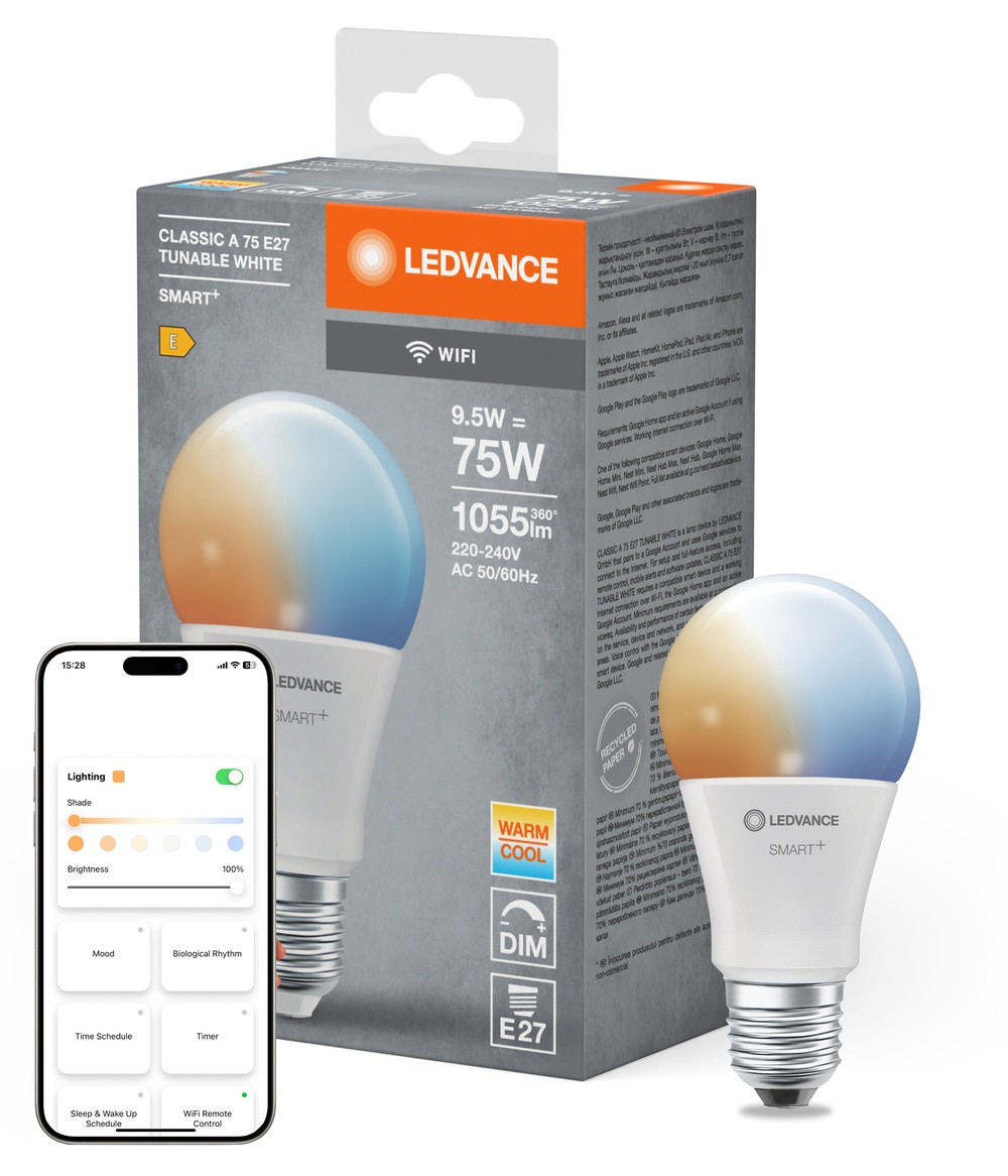 Klasyczny kształt żarówki z technologią WiFi. Cechy produktu: Możliwość sterowania za pomocą aplikacji LEDVANCE SMART+ (z systemem Android co najmniej 8.0 lub iOS 14.0). Możliwość sterowania przez Asystenta Google i Amazon Alexa. Protokół sieciowy: WiFi. Regulacja temperatury barwowej światła: 2700…6500 K. Ściemnialne. Trwałość: do 20 000 h. Zalety produktu: Sterowanie bezprzewodowe za pomocą aplikacji. Łatwy montaż i użycie. Nie zawiera rtęci. Niższe zużycie energii w porównaniu do lamp żarowych lub halogenowych. Obszary zastosowań: Oświetlenie ogólne. Pomieszczenia mieszkalne. Zastosowania profesjonalne (hotele, bary, butiki itp.). Do użytku na zewnątrz tylko w odpowiednich oprawach zewnętrznych. Wyposażenie / Akcesoria: Do sterowania za pomocą aplikacji LEDVANCE SMART+ wymagany jest smartfon lub tablet (z systemem Android co najmniej 8.0 lub iOS 14.0). Porady dotyczące bezpieczeństwa: Nie dotykaj lampy, jeśli jest stłuczona.. Nie wolno używać, jeśli zewnętrzne źródło światła jest uszkodzone..