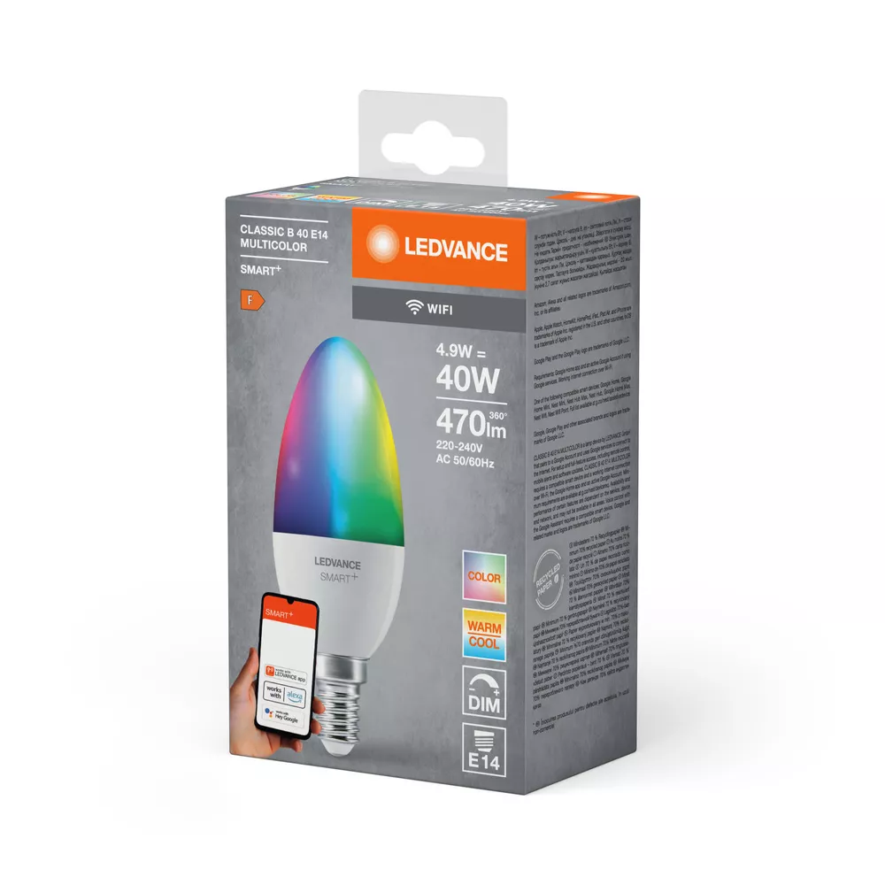 Klasyczny kształt żarówki świecowej z technologią WiFi. Cechy produktu: Możliwość sterowania za pomocą aplikacji LEDVANCE SMART+ (z systemem Android co najmniej 8.0 lub iOS 14.0). Regulacja temperatury barwowej światła: 2700…6500 K. Sterowanie kolorami RGB. Ściemnialne. Protokół sieciowy: WiFi. Trwałość: do 20 000 h. Sterowanie głosowe działa z Hej Google lub Alexa. Zalety produktu: Sterowanie bezprzewodowe za pomocą aplikacji. Łatwy montaż i użycie. Nie zawiera rtęci. Niższe zużycie energii w porównaniu do lamp żarowych lub halogenowych. Obszary zastosowań: Oświetlenie ogólne. Pomieszczenia mieszkalne. Zastosowania profesjonalne (hotele, bary, butiki itp.). Do użytku na zewnątrz tylko w odpowiednich oprawach zewnętrznych. Wyposażenie / Akcesoria: Do sterowania za pomocą aplikacji LEDVANCE SMART+ wymagany jest smartfon lub tablet (z systemem Android co najmniej 8.0 lub iOS 14.0). Porady dotyczące bezpieczeństwa: Nie dotykaj lampy, jeśli jest stłuczona.. Nie wolno używać, jeśli zewnętrzne źródło światła jest uszkodzone..