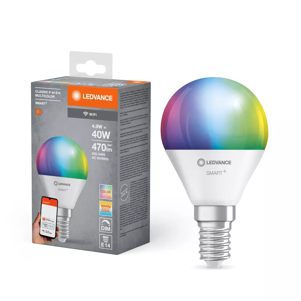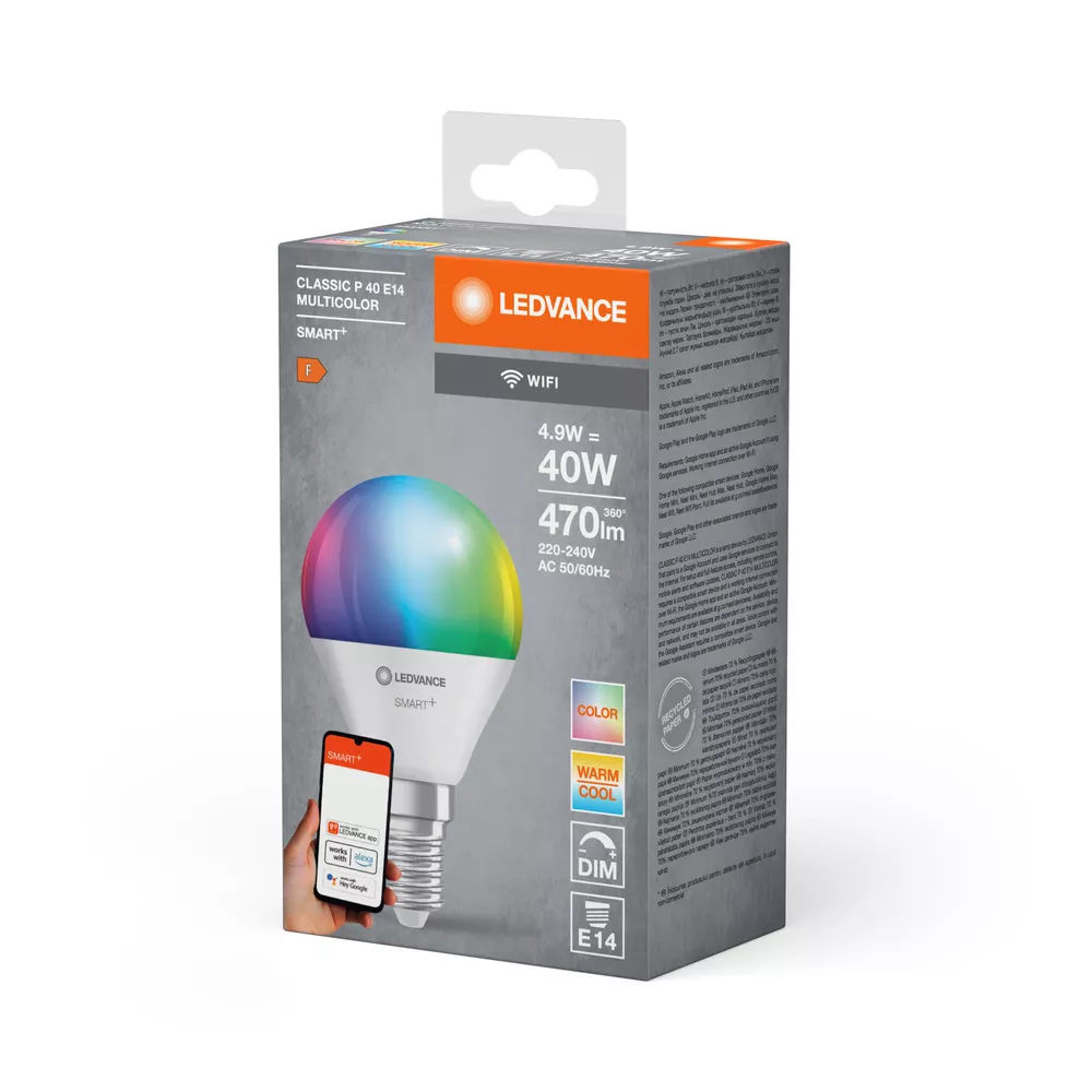 Klasyczny kształt żarówki kulistej z technologią WiFi. Cechy produktu: Możliwość sterowania za pomocą aplikacji LEDVANCE SMART+ (z systemem Android co najmniej 8.0 lub iOS 14.0). Regulacja temperatury barwowej światła: 2700…6500 K. Sterowanie kolorami RGB. Ściemnialne. Protokół sieciowy: WiFi. Trwałość: do 20 000 h. Sterowanie głosowe działa z Hej Google lub Alexa. Zalety produktu: Sterowanie bezprzewodowe za pomocą aplikacji. Łatwy montaż i użycie. Nie zawiera rtęci. Niższe zużycie energii w porównaniu do lamp żarowych lub halogenowych. Obszary zastosowań: Oświetlenie ogólne. Pomieszczenia mieszkalne. Zastosowania profesjonalne (hotele, bary, butiki itp.). Do użytku na zewnątrz tylko w odpowiednich oprawach zewnętrznych. Wyposażenie / Akcesoria: Do sterowania za pomocą aplikacji LEDVANCE SMART+ wymagany jest smartfon lub tablet (z systemem Android co najmniej 8.0 lub iOS 14.0). Porady dotyczące bezpieczeństwa: Nie dotykaj lampy, jeśli jest stłuczona.. Nie wolno używać, jeśli zewnętrzne źródło światła jest uszkodzone..