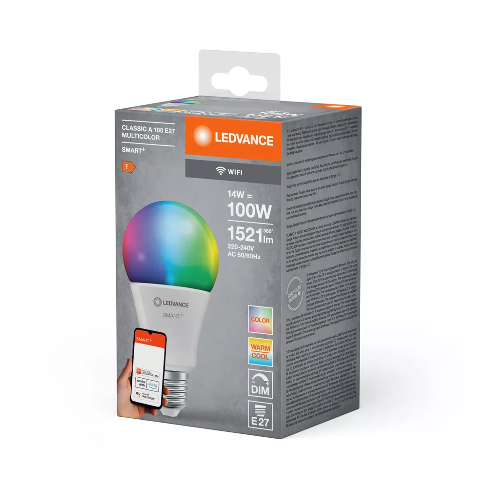 Klasyczny kształt żarówki z technologią WiFi. Cechy produktu: Możliwość sterowania za pomocą aplikacji LEDVANCE SMART+ (z systemem Android co najmniej 8.0 lub iOS 14.0). Regulacja temperatury barwowej światła: 2700…6500 K. Sterowanie kolorami RGB. Ściemnialne. Protokół sieciowy: WiFi. Trwałość: do 20 000 h. Sterowanie głosowe działa z Hej Google lub Alexa. Zalety produktu: Sterowanie bezprzewodowe za pomocą aplikacji. Łatwy montaż i użycie. Nie zawiera rtęci. Niższe zużycie energii w porównaniu do lamp żarowych lub halogenowych. Obszary zastosowań: Oświetlenie ogólne. Pomieszczenia mieszkalne. Zastosowania profesjonalne (hotele, bary, butiki itp.). Do użytku na zewnątrz tylko w odpowiednich oprawach zewnętrznych. Wyposażenie / Akcesoria: Do sterowania za pomocą aplikacji LEDVANCE SMART+ wymagany jest smartfon lub tablet (z systemem Android co najmniej 8.0 lub iOS 14.0). Porady dotyczące bezpieczeństwa: Nie dotykaj lampy, jeśli jest stłuczona.. Nie wolno używać, jeśli zewnętrzne źródło światła jest uszkodzone..