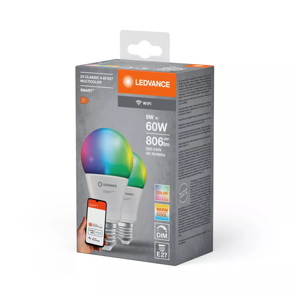 Klasyczny kształt żarówki z technologią WiFi. Cechy produktu: Możliwość sterowania za pomocą aplikacji LEDVANCE SMART+ (z systemem Android co najmniej 8.0 lub iOS 14.0). Regulacja temperatury barwowej światła: 2700…6500 K. Sterowanie kolorami RGB. Ściemnialne. Protokół sieciowy: WiFi. Trwałość: do 20 000 h. Sterowanie głosowe działa z Hej Google lub Alexa. Zalety produktu: Sterowanie bezprzewodowe za pomocą aplikacji. Łatwy montaż i użycie. Nie zawiera rtęci. Niższe zużycie energii w porównaniu do lamp żarowych lub halogenowych. Obszary zastosowań: Oświetlenie ogólne. Pomieszczenia mieszkalne. Zastosowania profesjonalne (hotele, bary, butiki itp.). Do użytku na zewnątrz tylko w odpowiednich oprawach zewnętrznych. Wyposażenie / Akcesoria: Do sterowania za pomocą aplikacji LEDVANCE SMART+ wymagany jest smartfon lub tablet (z systemem Android co najmniej 8.0 lub iOS 14.0). Porady dotyczące bezpieczeństwa: Nie dotykaj lampy, jeśli jest stłuczona.. Nie wolno używać, jeśli zewnętrzne źródło światła jest uszkodzone..